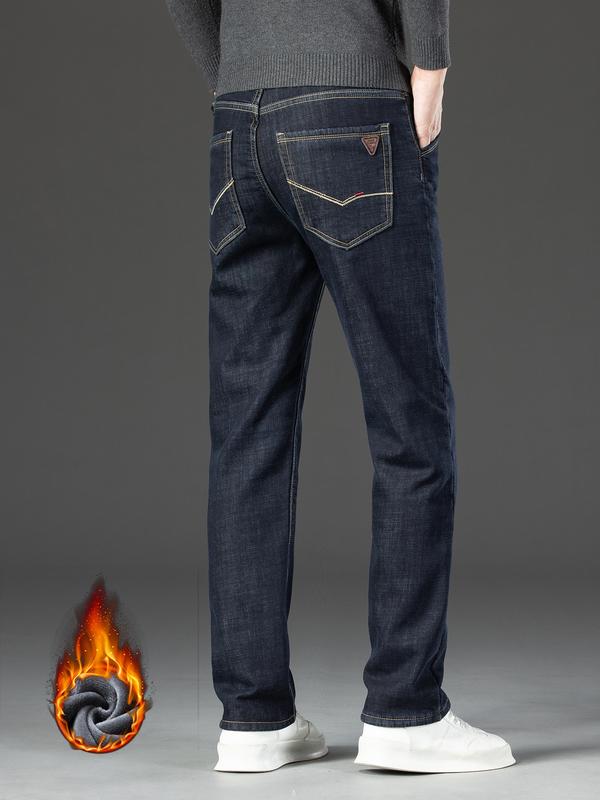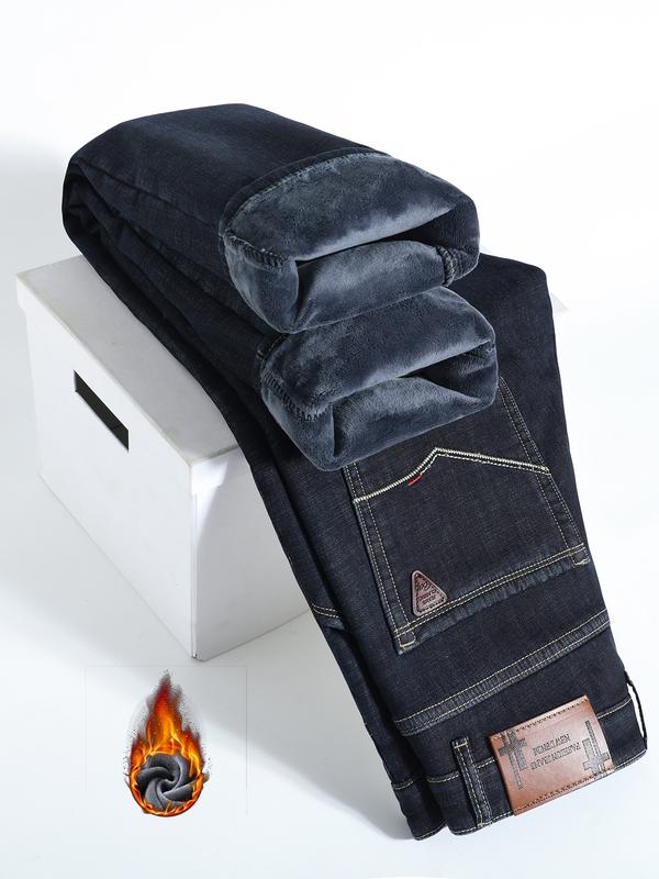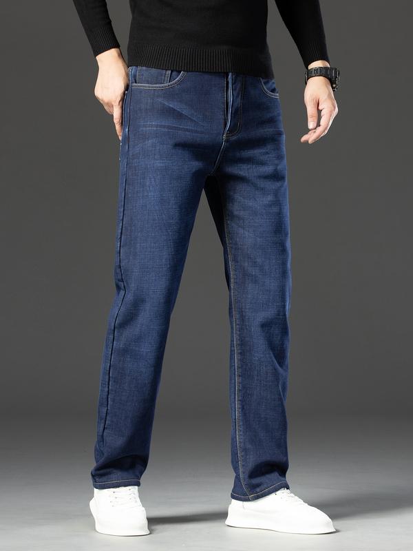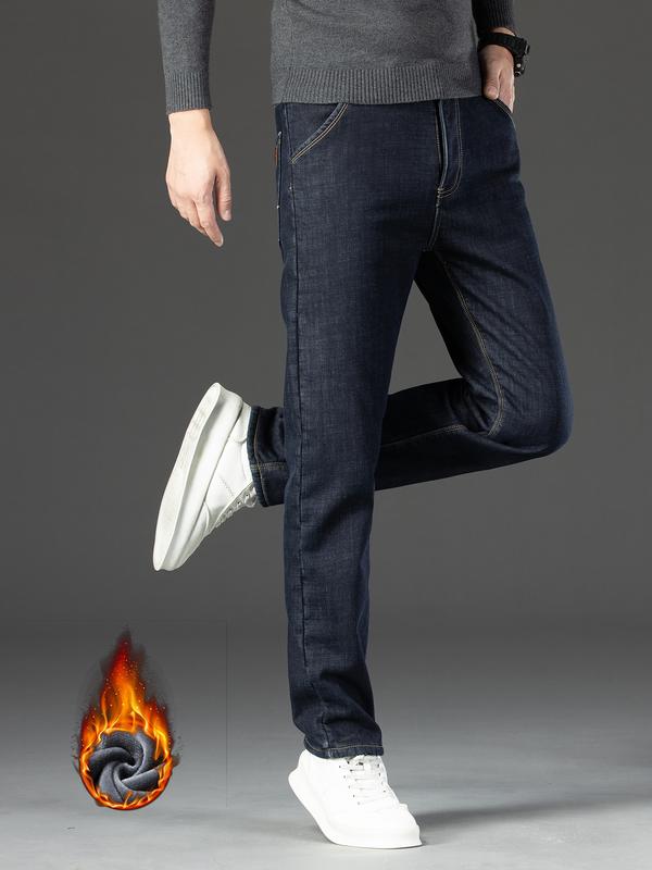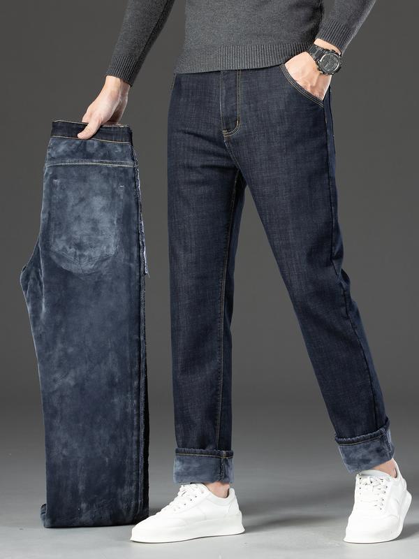Men's Fleece Lined Denim Jeans, Loose Straight Leg Long Pants, Warm Cotton Elastic Business Style, Fall Winter Fashion