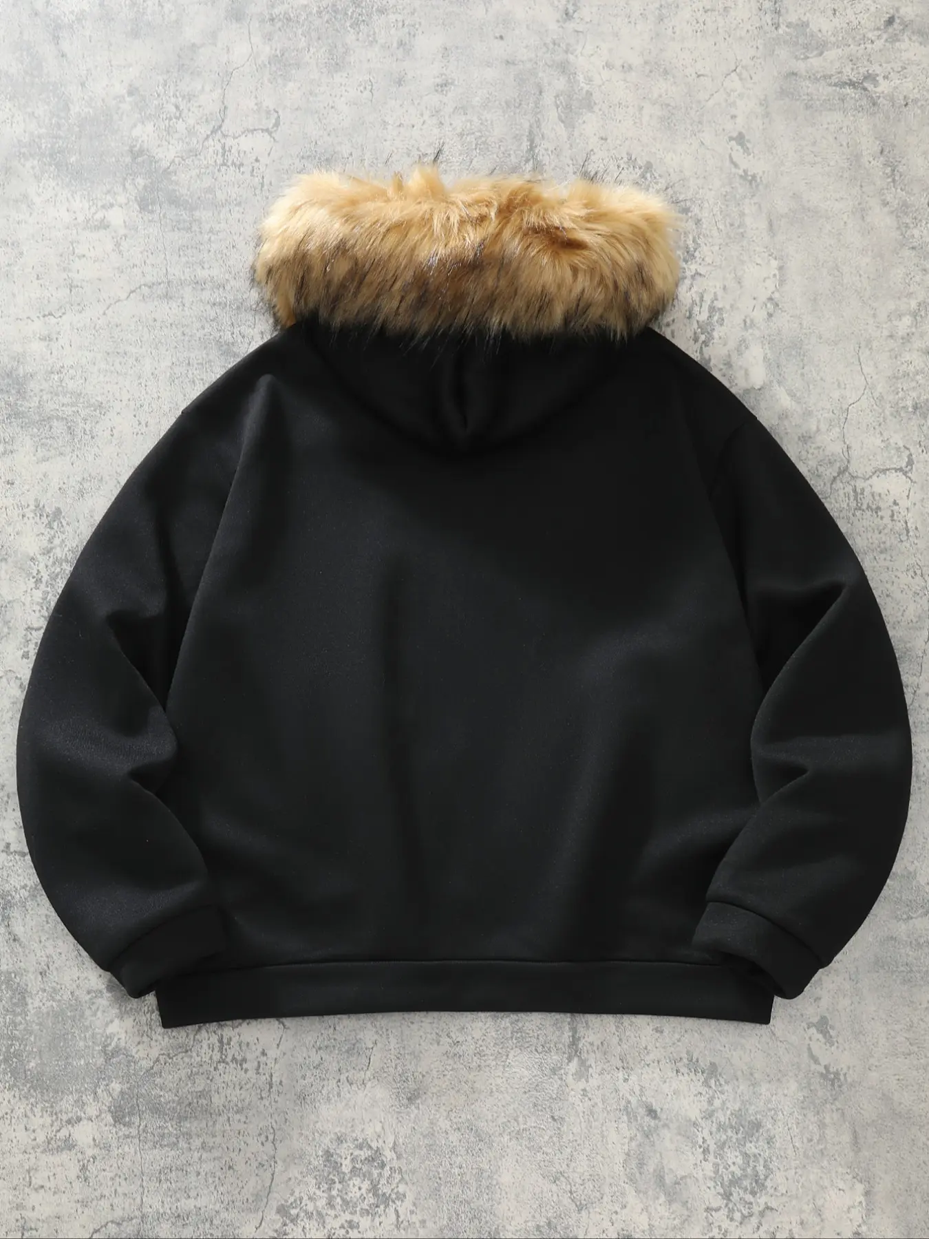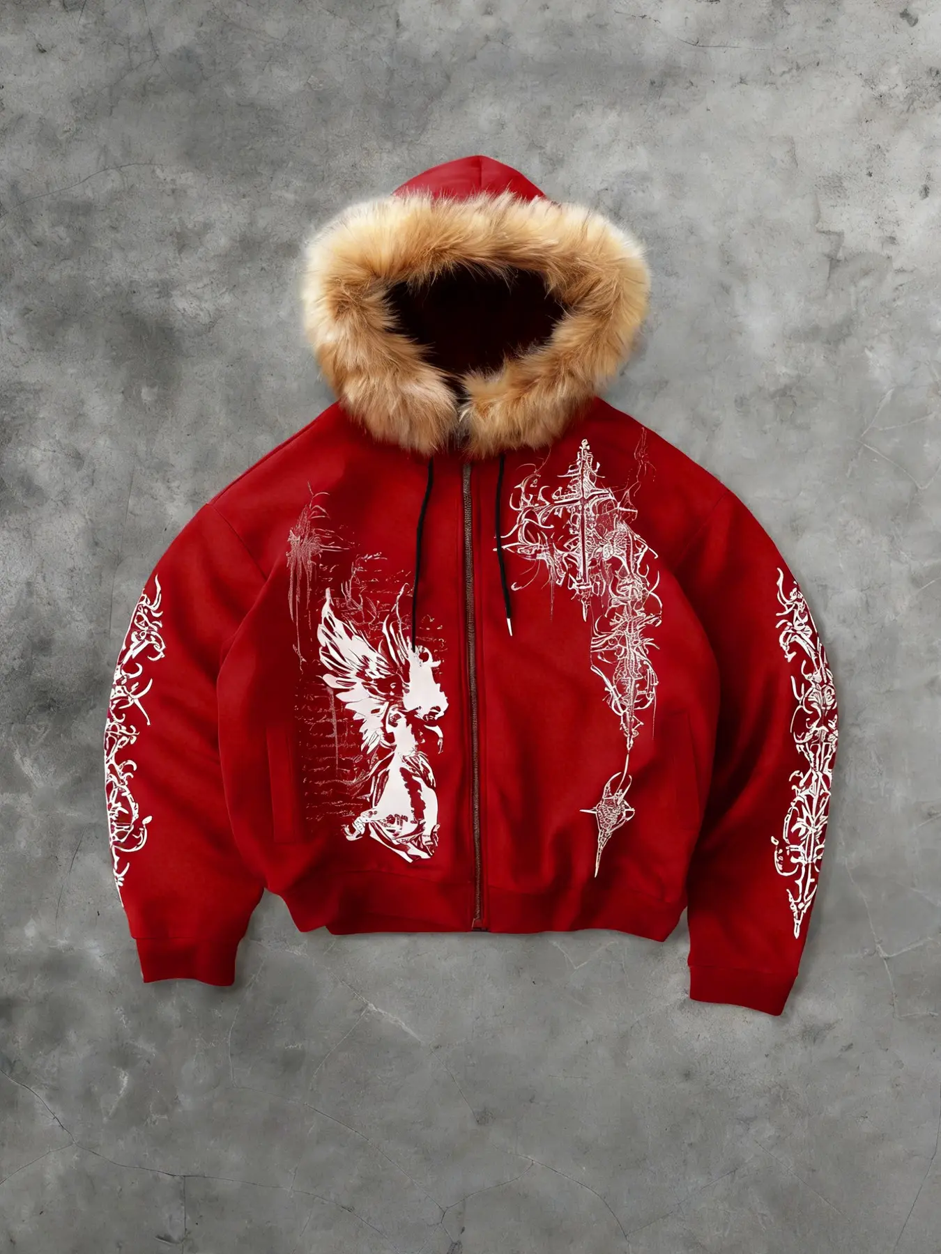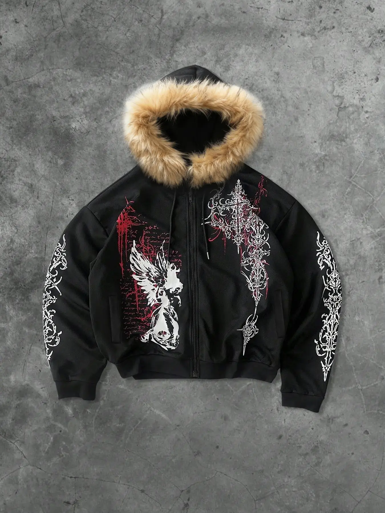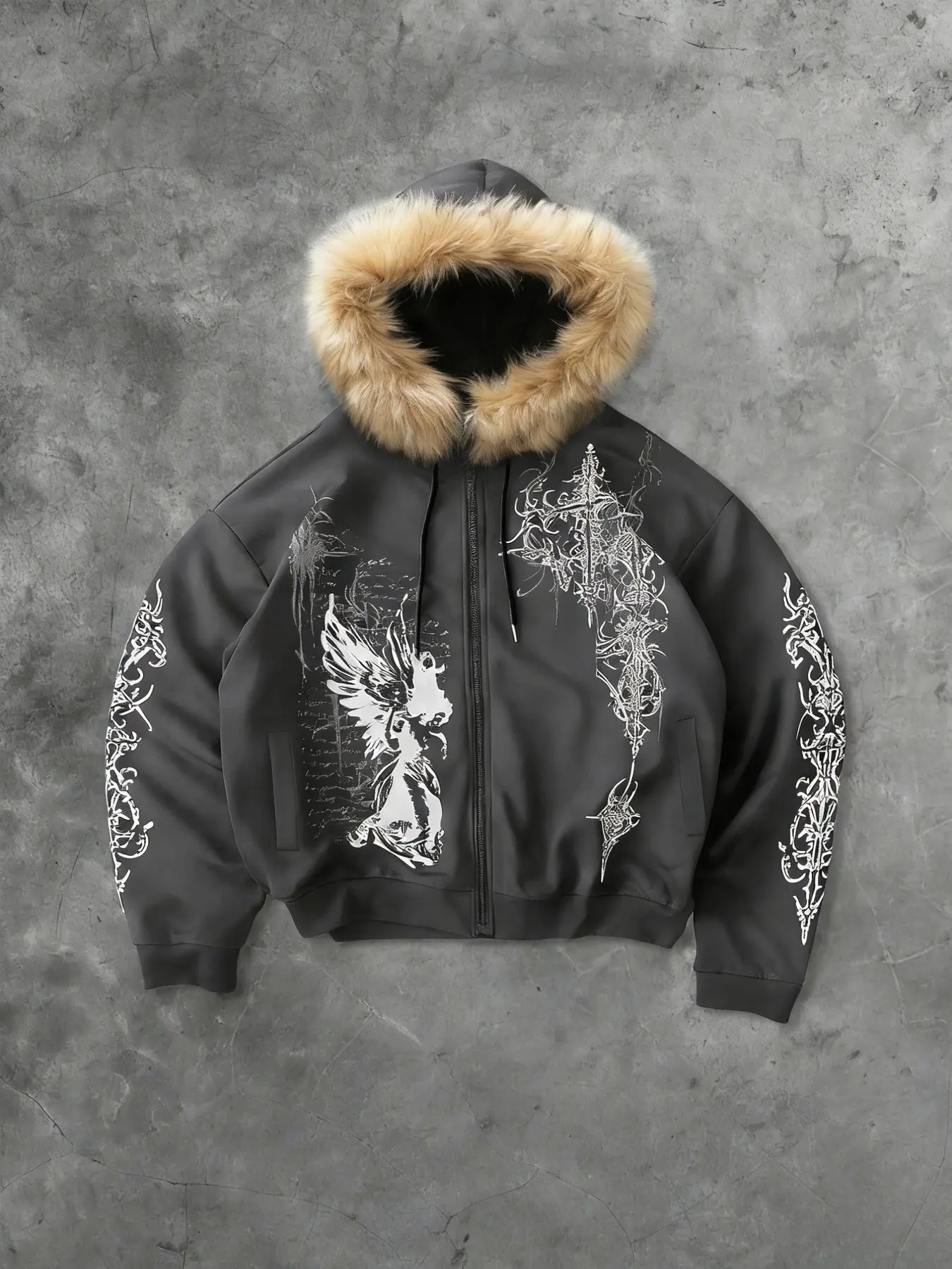 Unique style streetwear jacket with gothic print and faux fur hood #tiktokshopcreatorpicks #streetwear #mensfashion #jacket #style