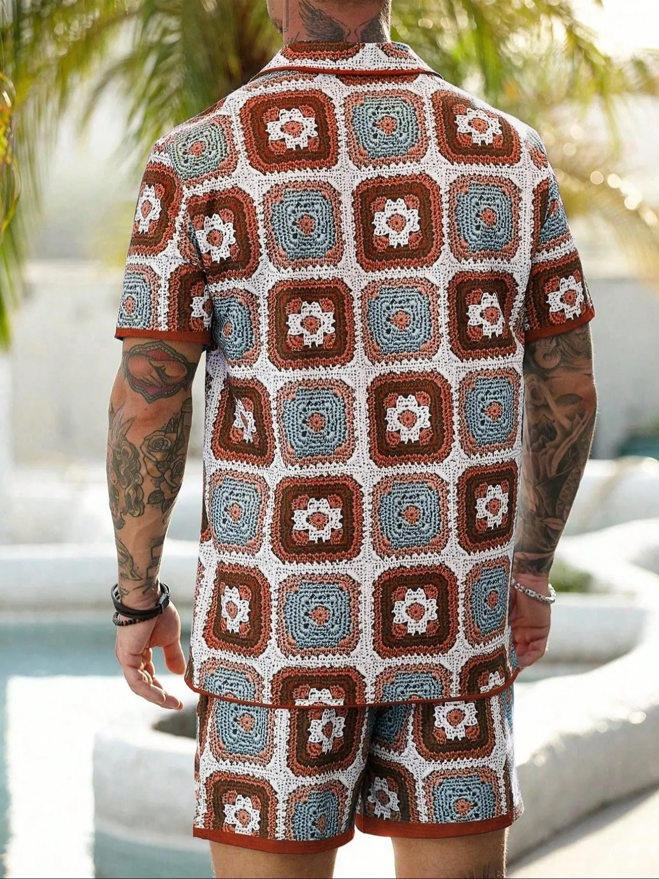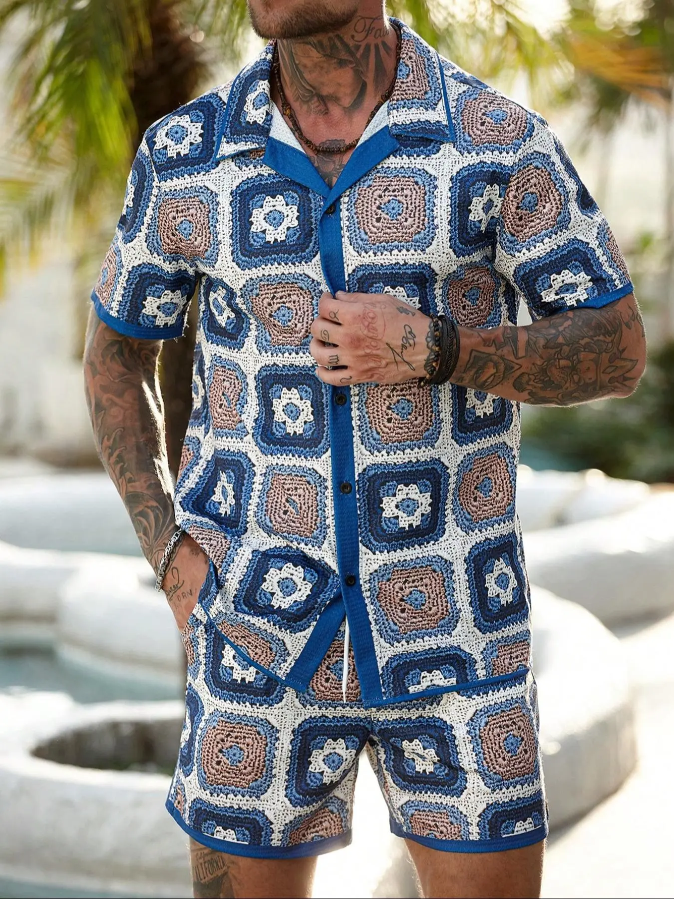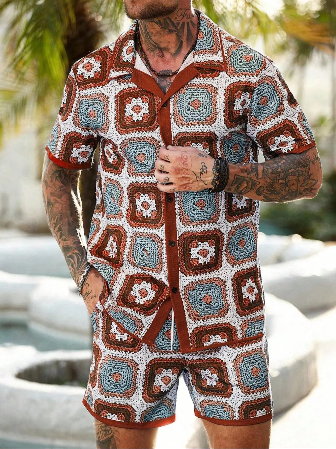 【Two-Piece Set】: Includes a short-sleeve button-up shirt and drawstring shorts, providing an easy and coordinated option for summer outings or vacations.