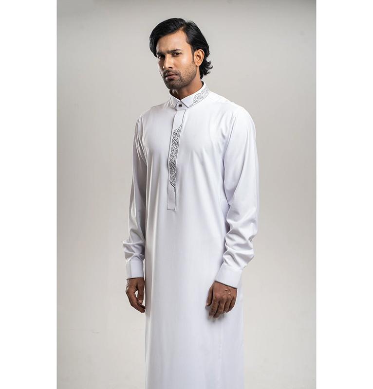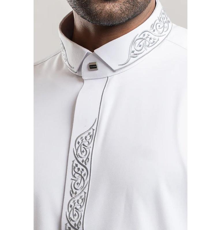 Men's Full Length Islamic Thobe 214 - Diwani White Looking for a unique thobe? Then the Diwani those is what you need! This thobe has a unique winged collar with an inspired artistic Arabic design on the side of the collar and down the front. The embroidered script adds refined touch of culture. Match with your son with the same design for boys. Look smooth and modest together whether you choose to wear it for daily salah, day to day or special occasions such as Eid and Ramadan!