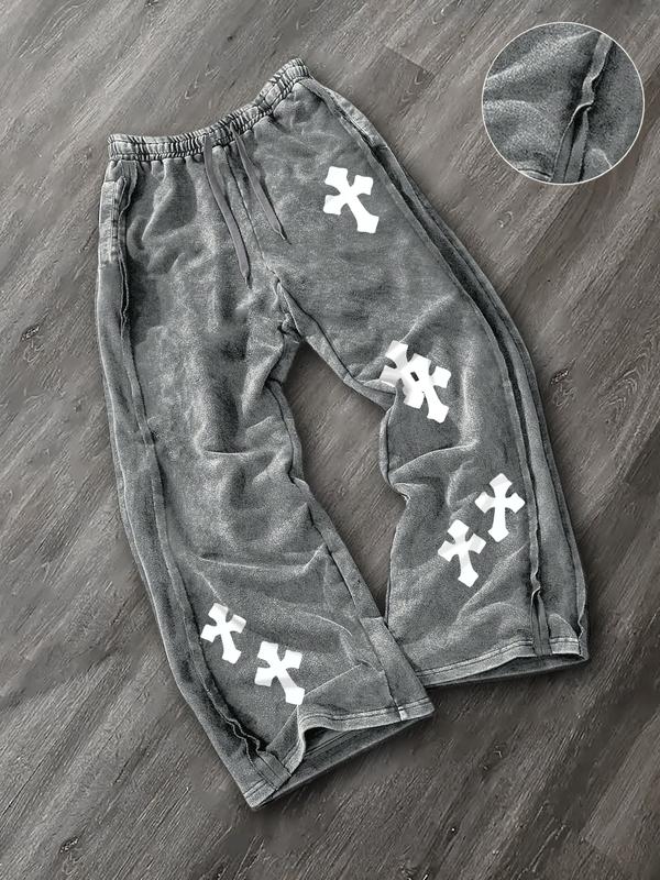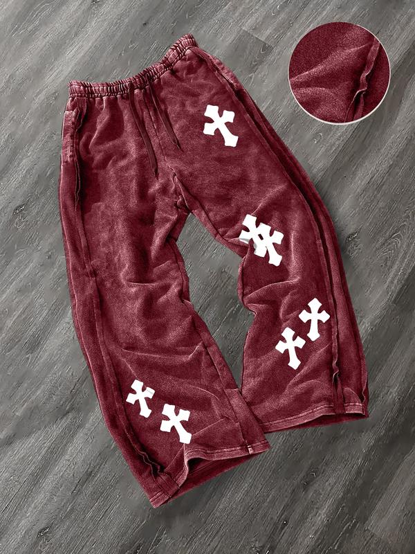 Men's Washed Cotton Straight Leg Long Pants, Cross Print, Casual Fashion, Comfortable Fit, Perfect for Daily Wear, Casual Lounge Pant