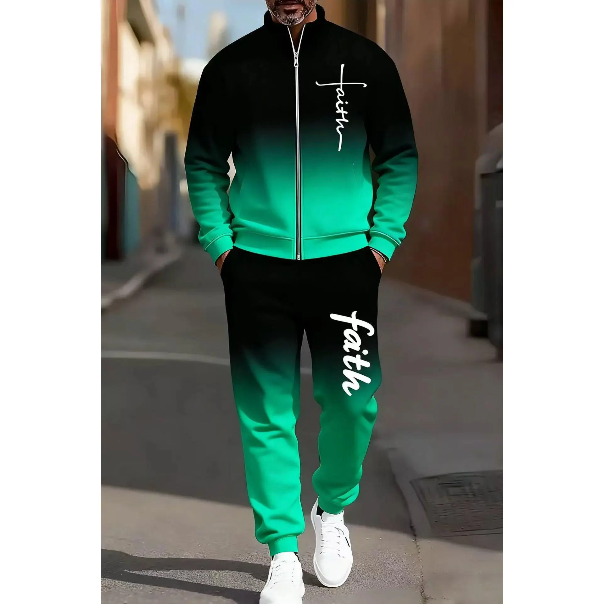 Men's fashionable and casual sportswear featuring a gradient digital print, including a stand-up collar cardigan jacket and pants, making it a two-piece set suitable for daily casual wear and trendy gradient sportswear series, Sporty Style Breathable Acti