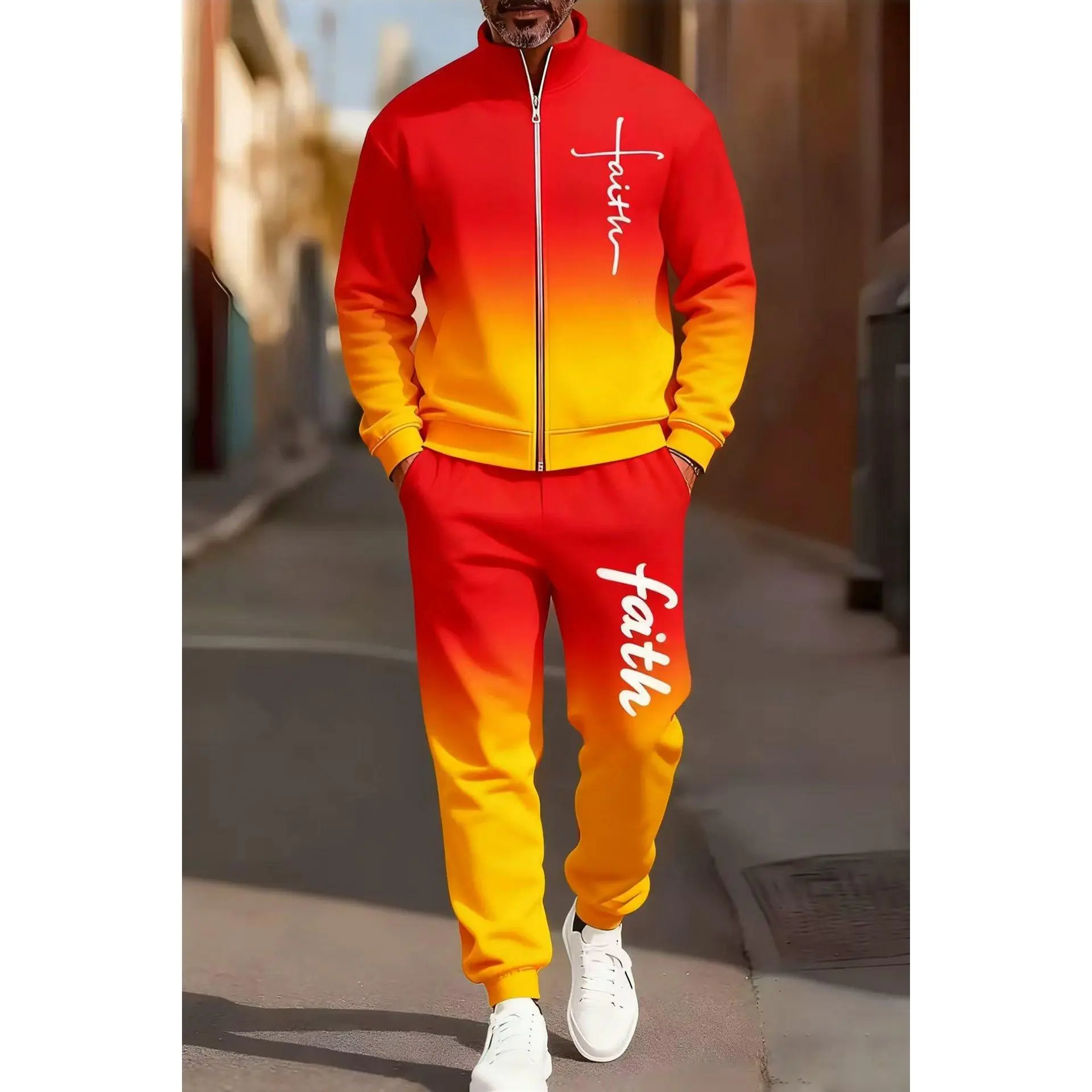 5. Men's fashionable and casual sportswear featuring a gradient digital print, including a stand-up collar cardigan jacket and pants, making it a two-piece set suitable for daily casual wear and trendy gradient sportswear series, Sporty Style Breathable Acti