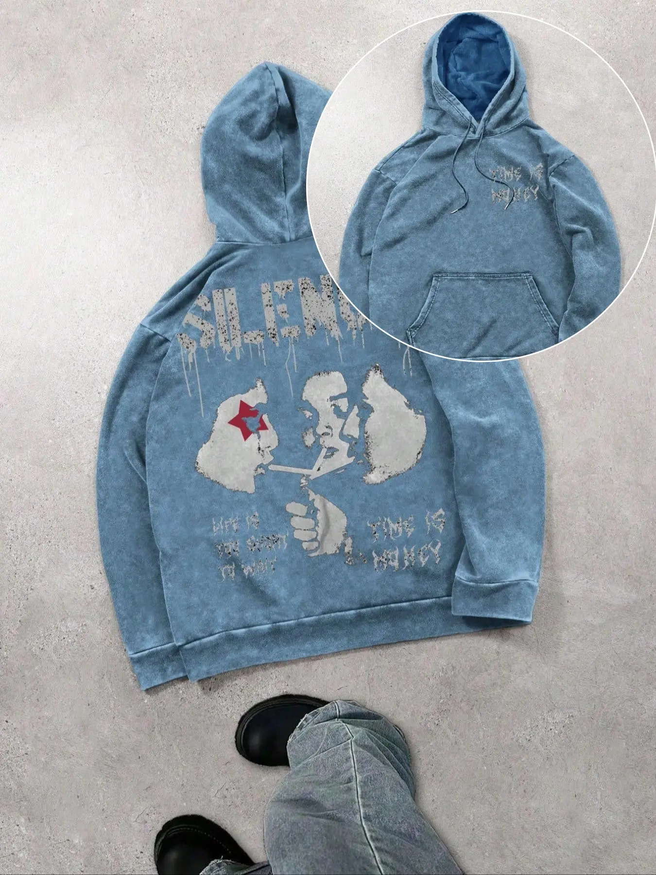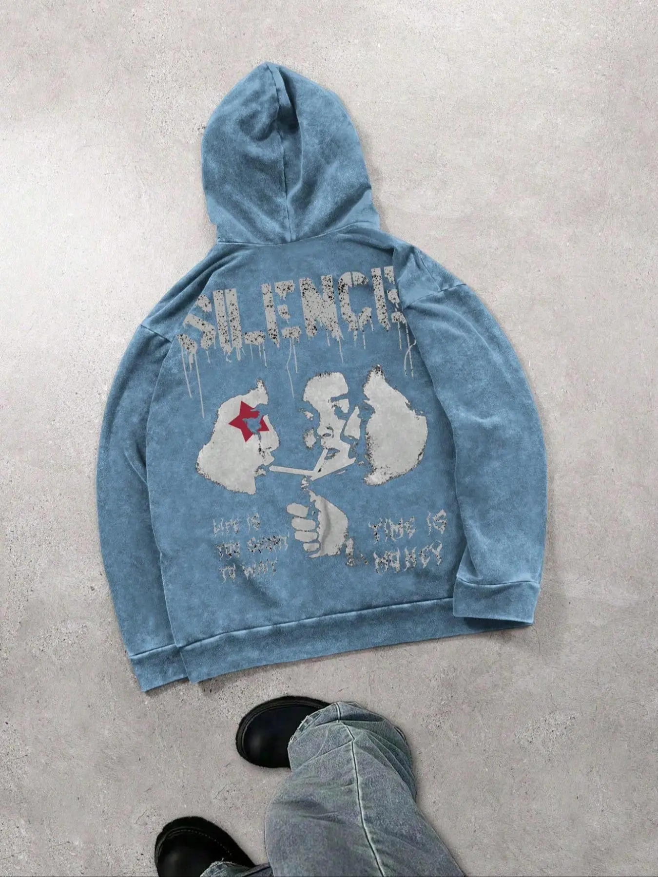 This hoodie gives grunge street style without trying too hard. The faded blue and cracked graphic make it look perfectly worn-in — and it’s on clearance 👀 #StreetStyle #GrungeAesthetic #HoodieSeason #TikTokFinds #StreetwearLooks