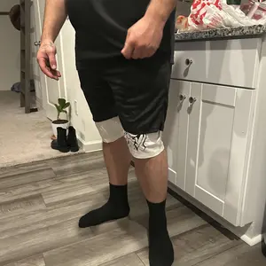 Compression shorts don’t compress and are also a little too long for the image to be a peek-a-boo. Sizes run a little small. Size up.