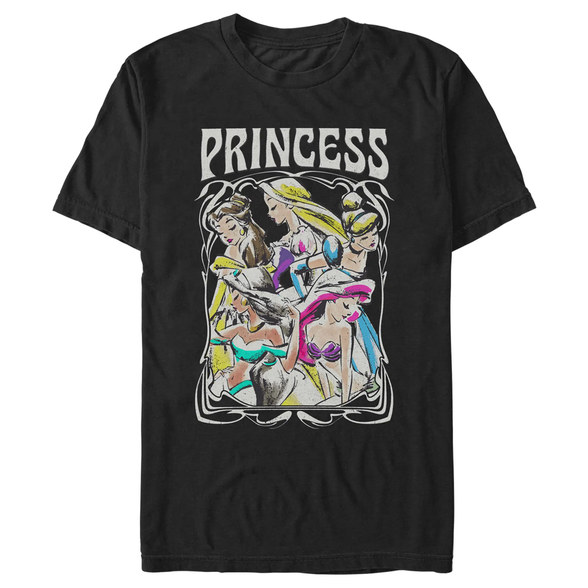 Strut your stuff with this stylish new men's t-shirt that is perfect for every occasion! Featuring Belle, Rapunzel, Cinderella, Jasmine, and Ariel in colorful watercolor print and the word "Princess" above.