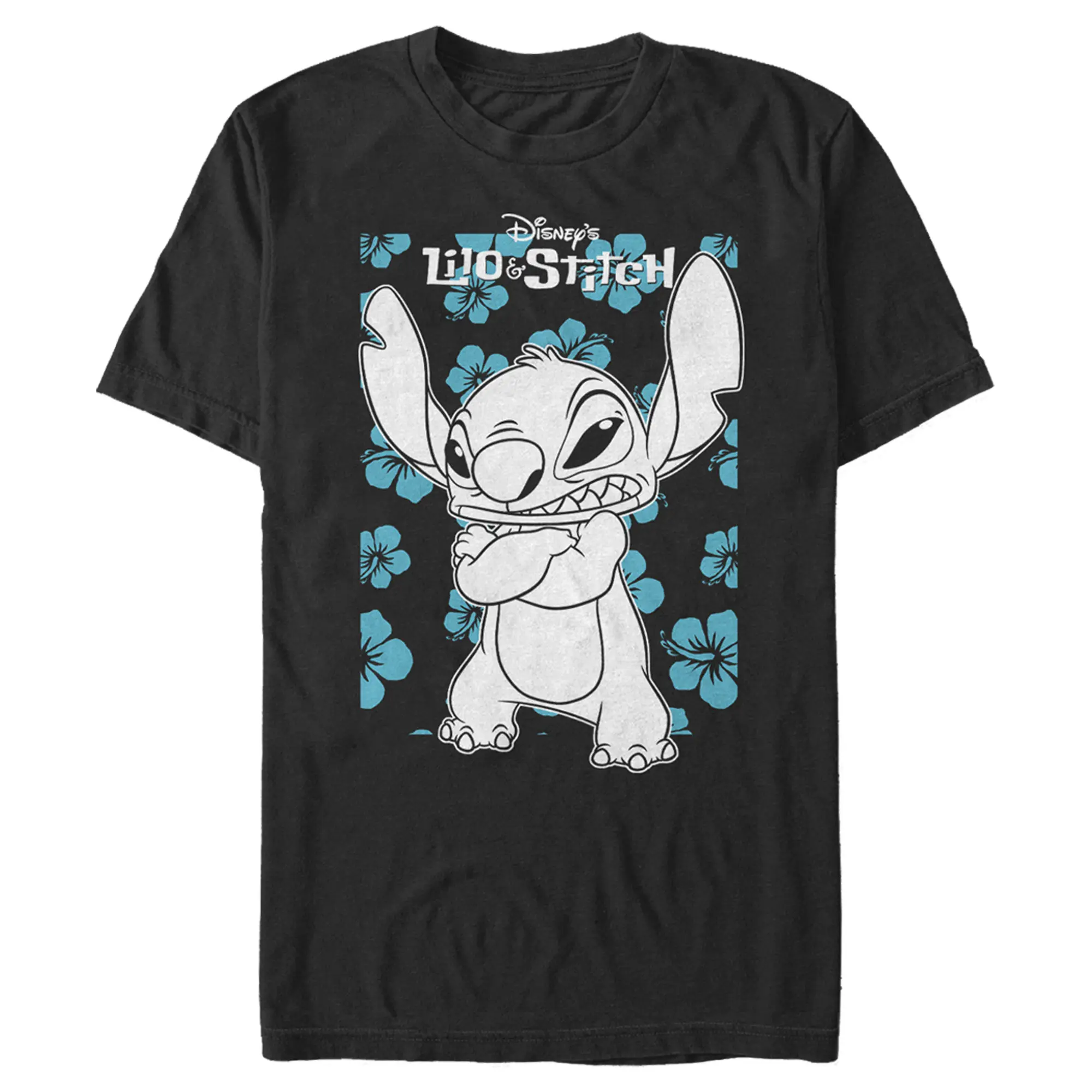 Strut your stuff with this stylish new men's t-shirt that is perfect for every occasion! Featuring a grumpy Stitch with blue Hawaiian flowers all around him.