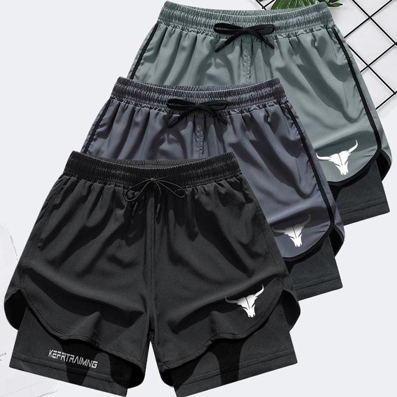 Men's Letter & Bull Head Print 2 in 1 Double Layer Drawstring Waist Gym Shorts, Regular Fit Casual Comfortable Breathable Quick Drying Anti-Exposure Pocket Shorts for Gym Workout Running, Men's Bottoms for Summer