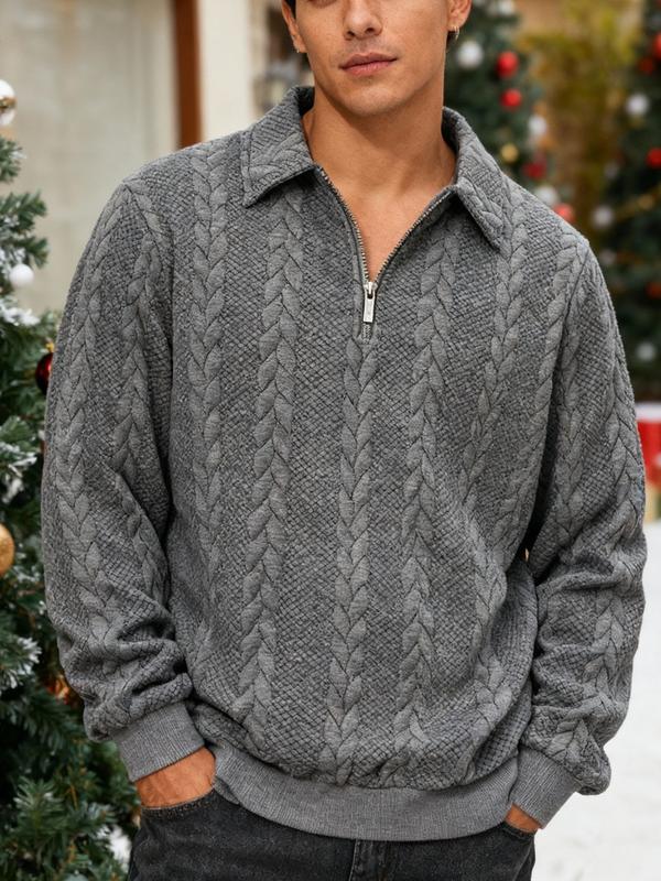 Men's Textured Polo Neck Sweatshirt, Zip Half Button Design, Casual Fitted Pullover, Fall & Winter Essential, Plain Style