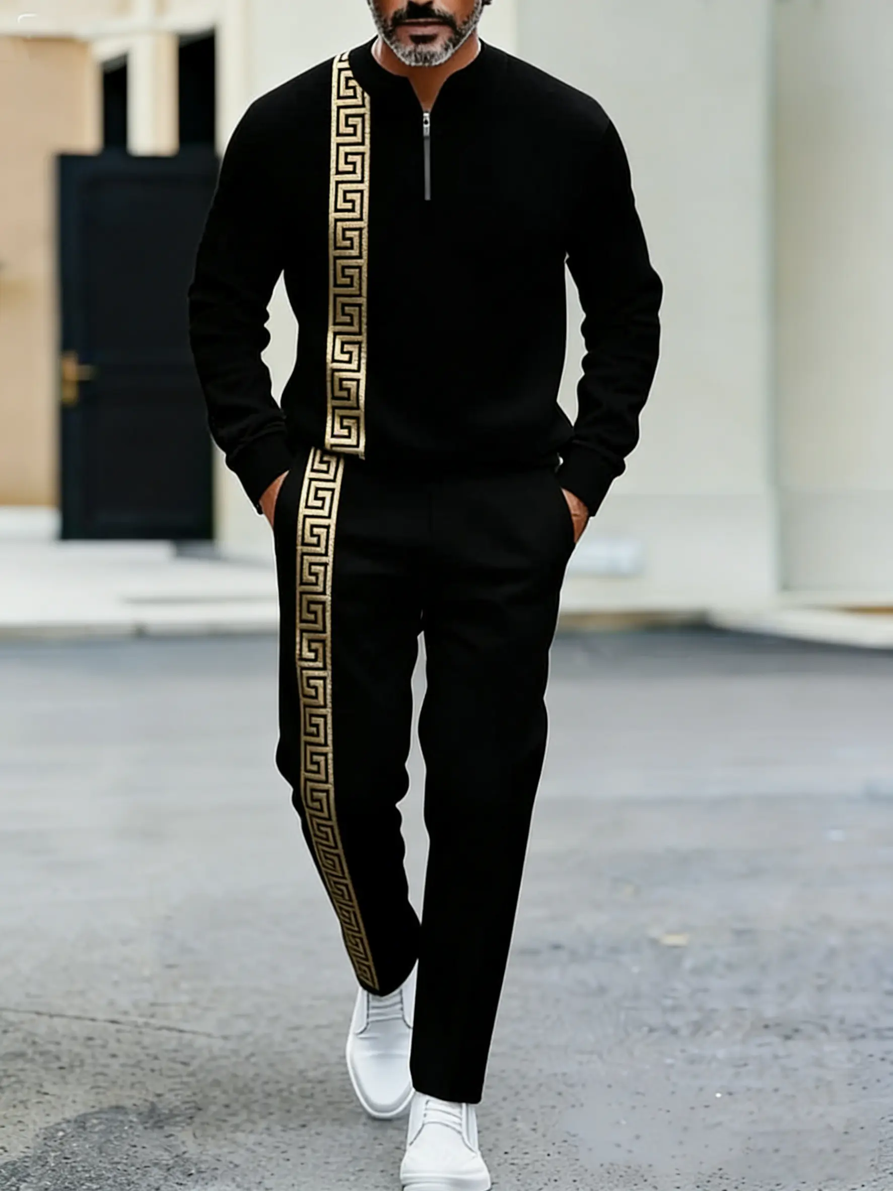 Men's half zip-up sweatshirt and pants set with Greek key design details, stylish sports outfit suitable for casual streetwear