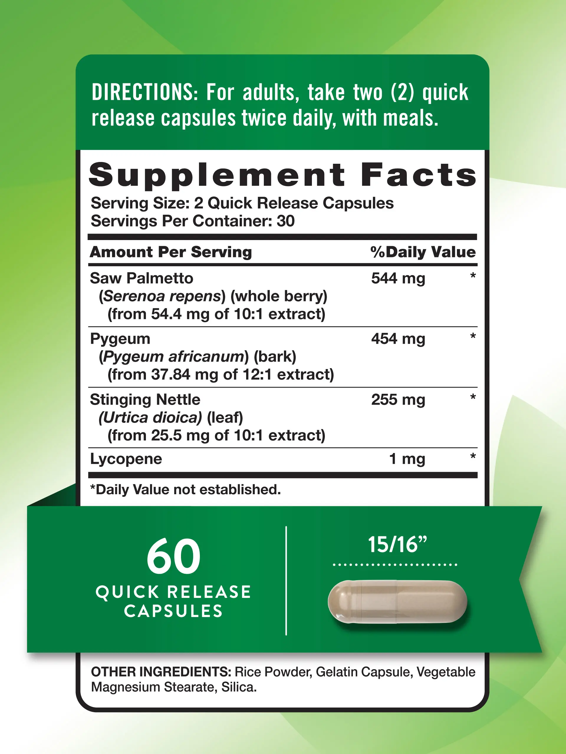 This advanced herbal formula combines three traditional ingredients — Saw Palmetto, Pygeum, and Lycopene — that have been valued for centuries in men’s wellness. Delivered in quick-release capsules, this unique blend provides a convenient addition to your daily regimen.