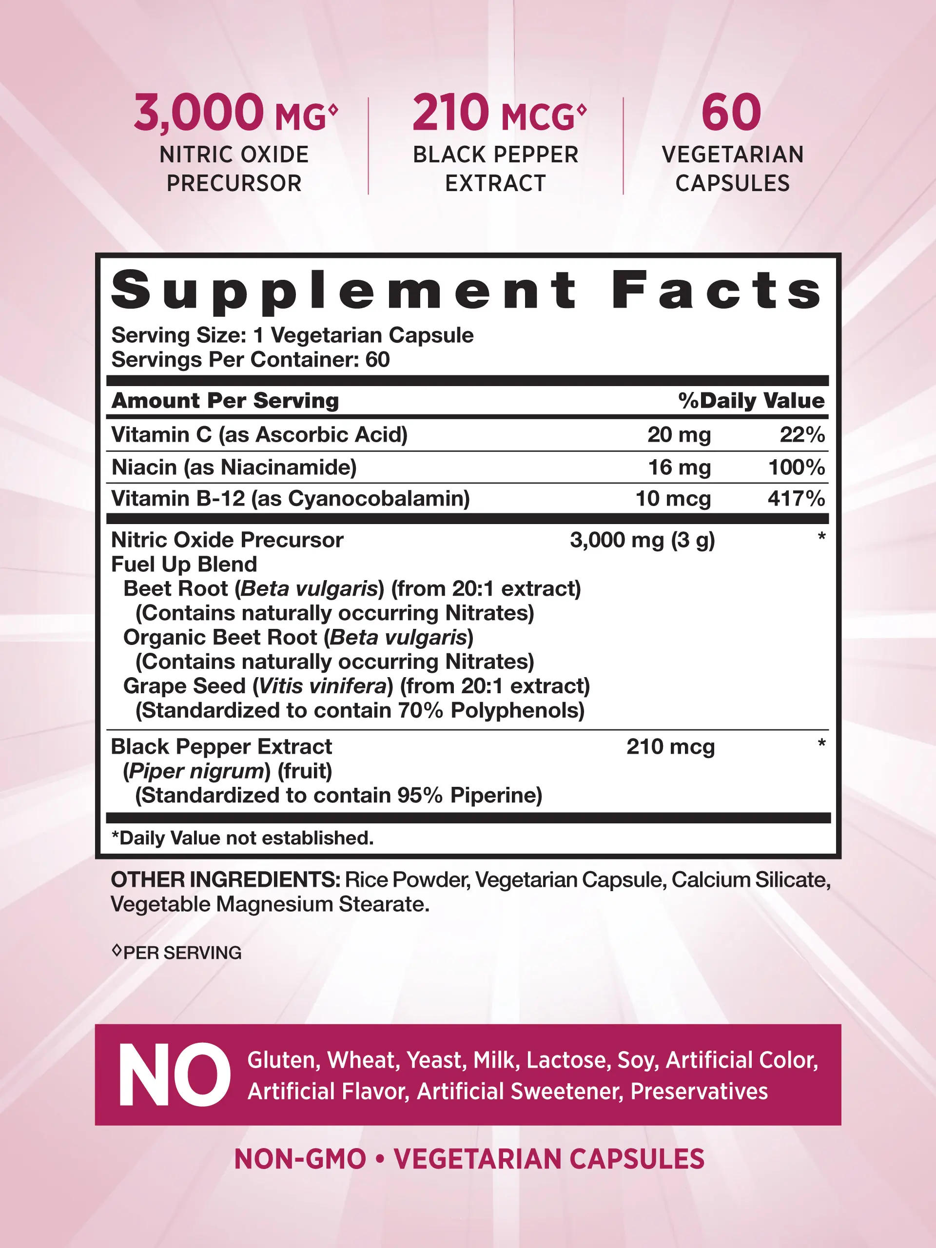 Beet Root + capsules with nitrates deliver a 3,000 mg Nitric Oxide Precursor blend of beet root powder, beet root extract equivalent, and grape seed extract equivalent. One capsule also supplies an excellent source of Vitamin C, Niacin, and Vitamin B-12, and is ideal to take a half hour pre-workout or between meals up to two times daily.