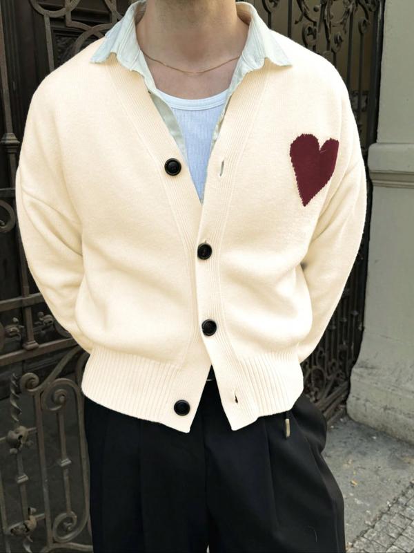 Men's Heart Pattern Knit Cardigan, Casual Loose-Fitting Long Sleeve Sweater, Lightweight Layering Piece for Fall & Winter