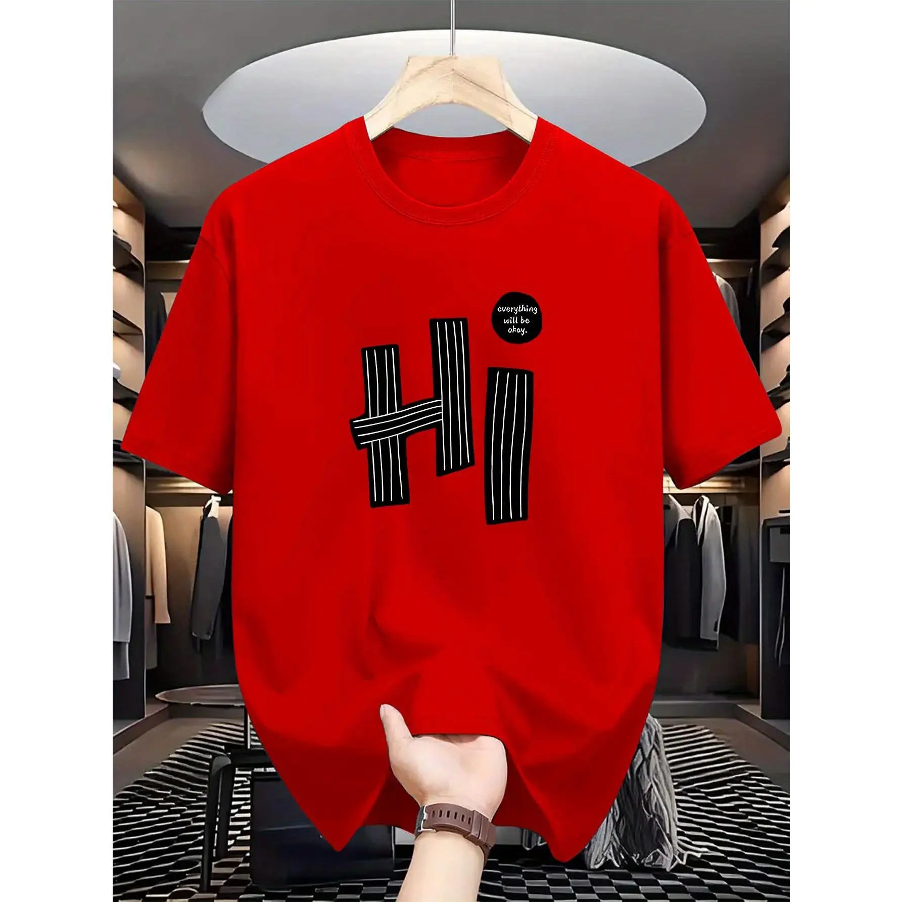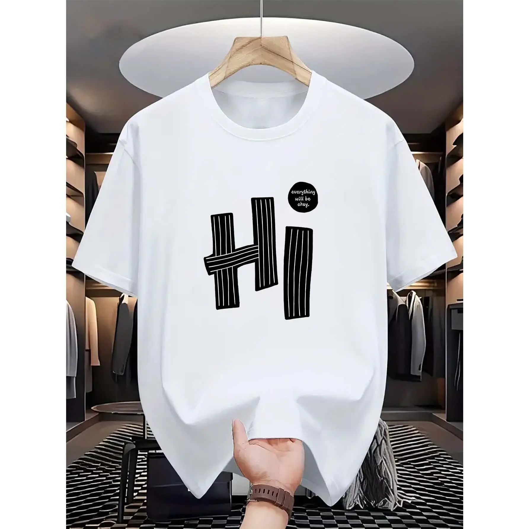 5. "hi" Letter, Pattern Print, Men's T-Shirt, Men's Novelty Pattern Design T-Shirt, Summer Casual Comfortable T-Shirt, Fashion Short Sleeve Comfortable Versatile Summer T-Shirt Top Round Neck Menswear Shortsleeve Polyester