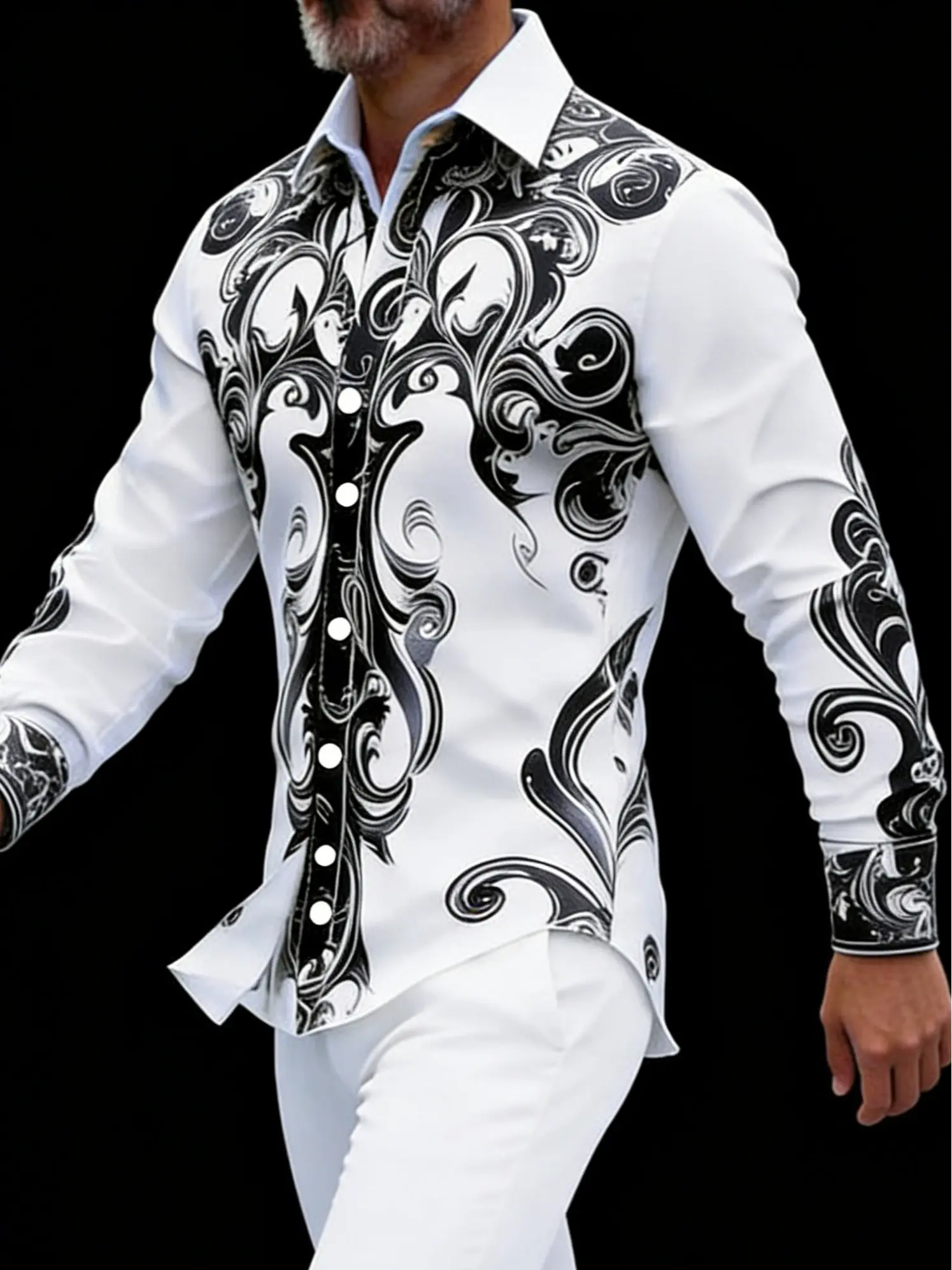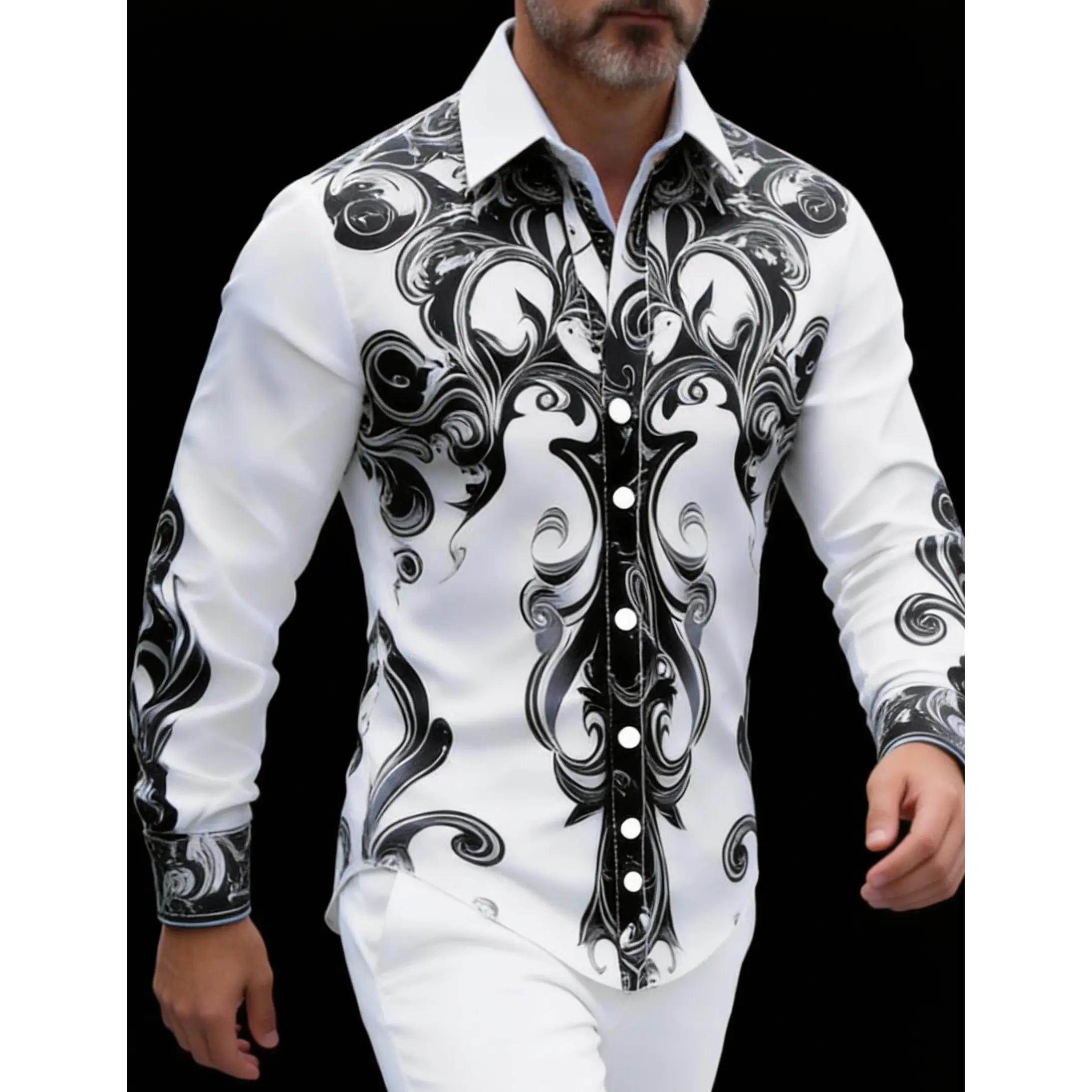 5. Men's High-End Printed Shirt Black & White Baroque Pattern Slim-Fit Daily Casual Shirt
