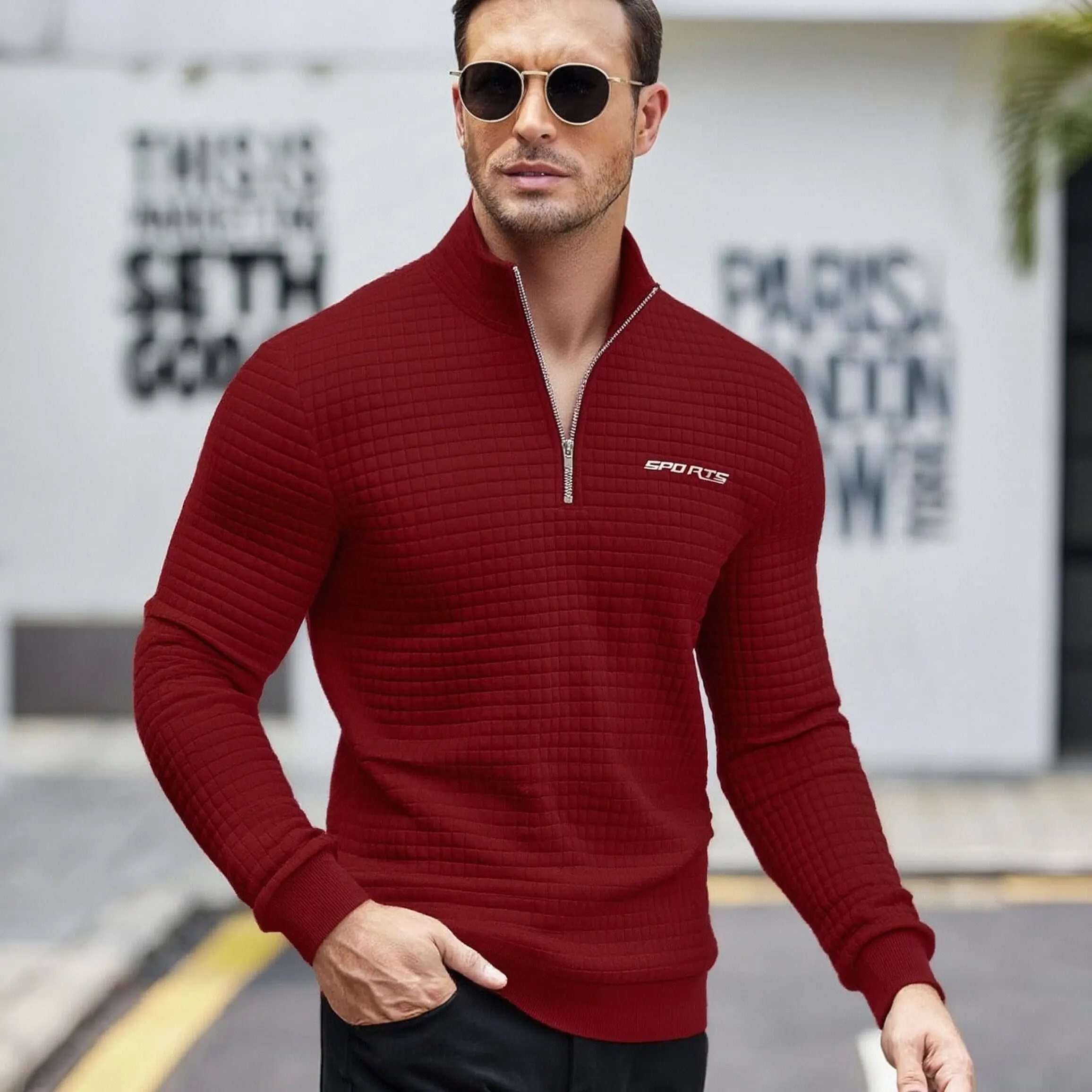 5. Men'S High-Neck Sweatshirt with Half Zipper for Sports, Featuring a Small Checkered Pattern, Suitable for Fitness And Running, with Long Sleeves And Ribbed Cuffs. quarter zip tiktok shop gifts for him vacation outfits