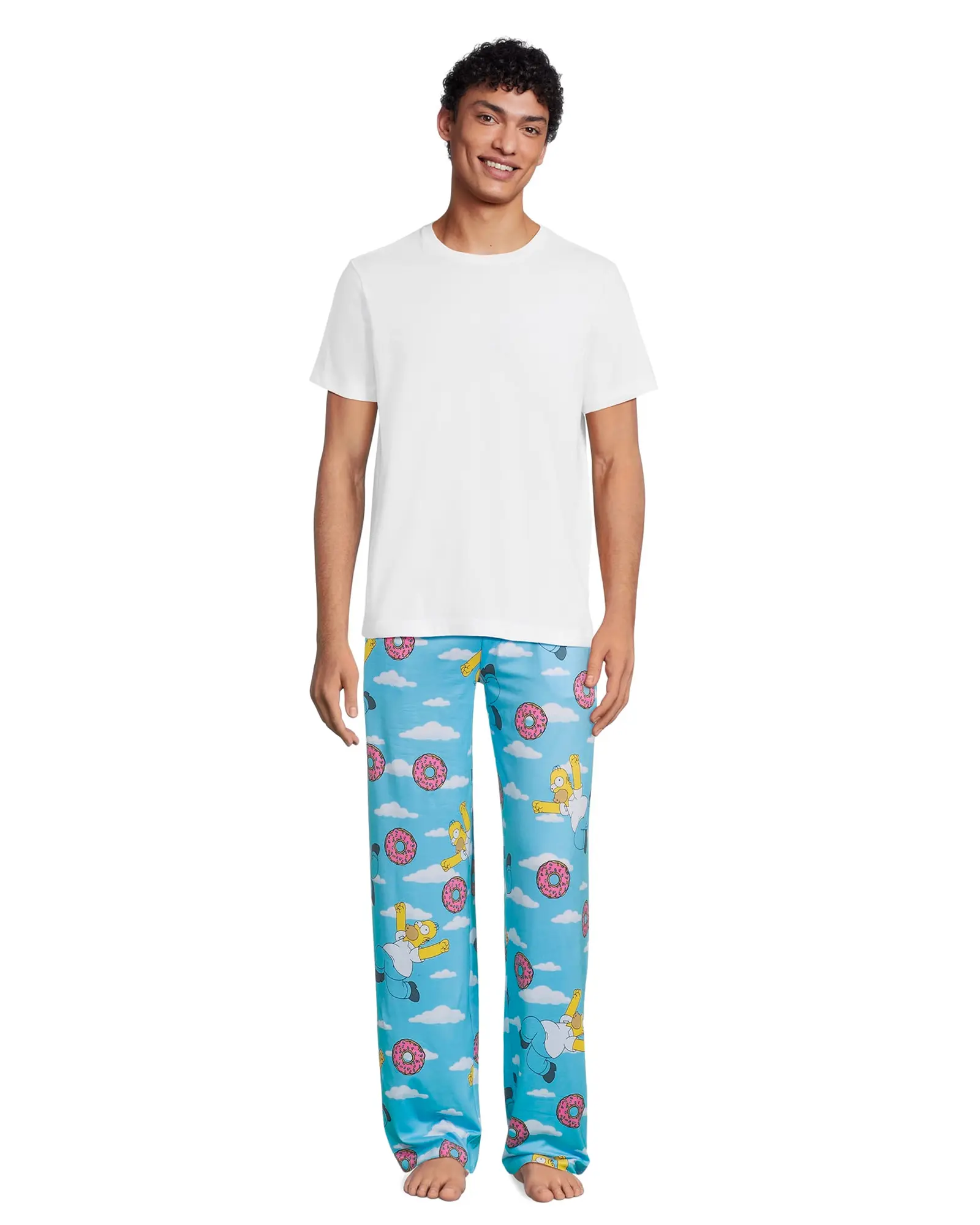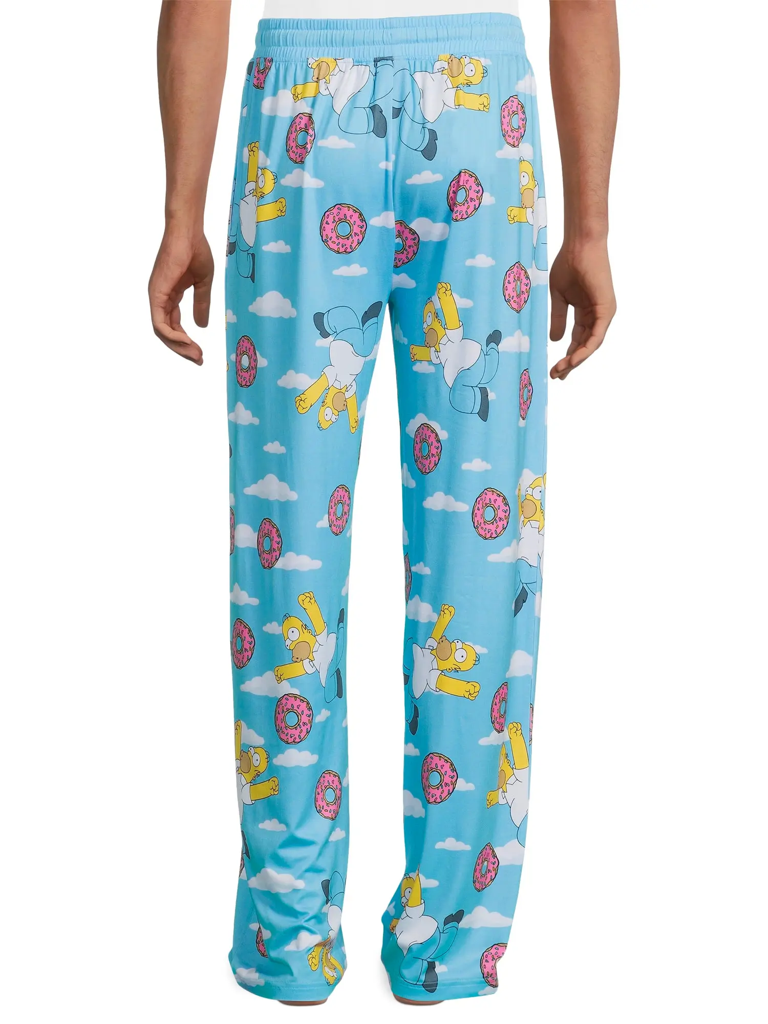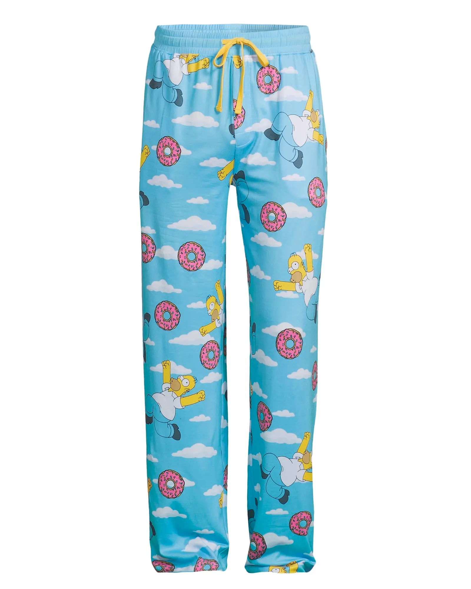 These men's Simpsons pajama pants feature a full-coverage Homer Simpson doughnut print on a stretch polyester-spandex fabric. The design includes a wide elastic waistband with an adjustable drawstring, a button fly, and two side pockets. The lightweight construction supports ease of movement while maintaining a consistent shape. The Simpsons franchise is known for its animated characters and recognizable visual style. Homer Simpson's expressive design translates naturally into printed sleepwear graphics. These PJ bottoms combine character artwork with functional construction suited for lounging and sleep. Comfortable Pajama Bottoms for Daily Wear: These men's PJ pants are designed to reduce stiffness and pulling during rest or lounging. The polyester-spandex blend provides flexibility while maintaining a lightweight feel. Fabric stretch supports movement when sitting or walking. Ideal for extended indoor wear. All-Over Homer Simpson Doughnut Print: The sleep pants feature Homer Simpson positioned in the sky with pink sprinkled doughnuts and cloud details. His raised arms and forward leg create a sense of motion across the print. The repeating pattern provides consistent coverage from waistband to cuffs. Colors remain visible without overwhelming the design. Stretch Fabric with Functional Waistband: These pajama trousers are made from 95% polyester and 5% spandex for added flexibility. A wide elastic waistband measuring approximately 2 inches offers stable placement. The yellow drawstring allows adjustable tension without pressure points. Designed to stay secure during movement. Pocketed PJ Construction with Easy Care: Two side pockets provide space for small essentials while lounging. A button fly adds convenience without altering the overall fit. Machine wash cold with non-chlorine bleach when needed and tumble dry low. Avoid ironing to help maintain fabric elasticity and print clarity. Versatile Sleepwear and Lounge Pants: These pajamas function as sleep bottoms or casual lounge pants. The stretch material supports a relaxed fit without feeling restrictive. Designed to pair easily with tees, tanks, or hooded tops. Suitable for rotating between sleepwear and indoor wear.