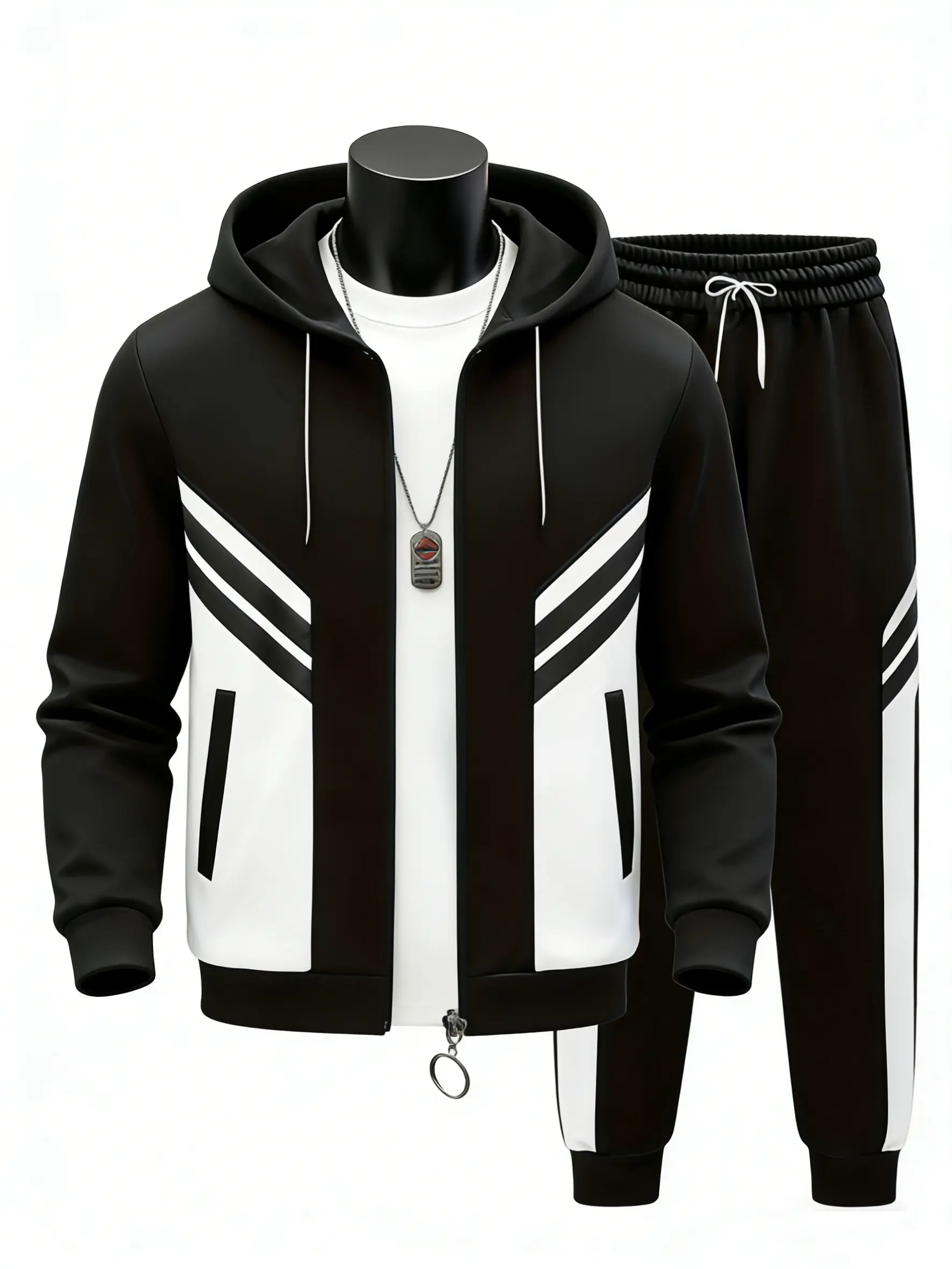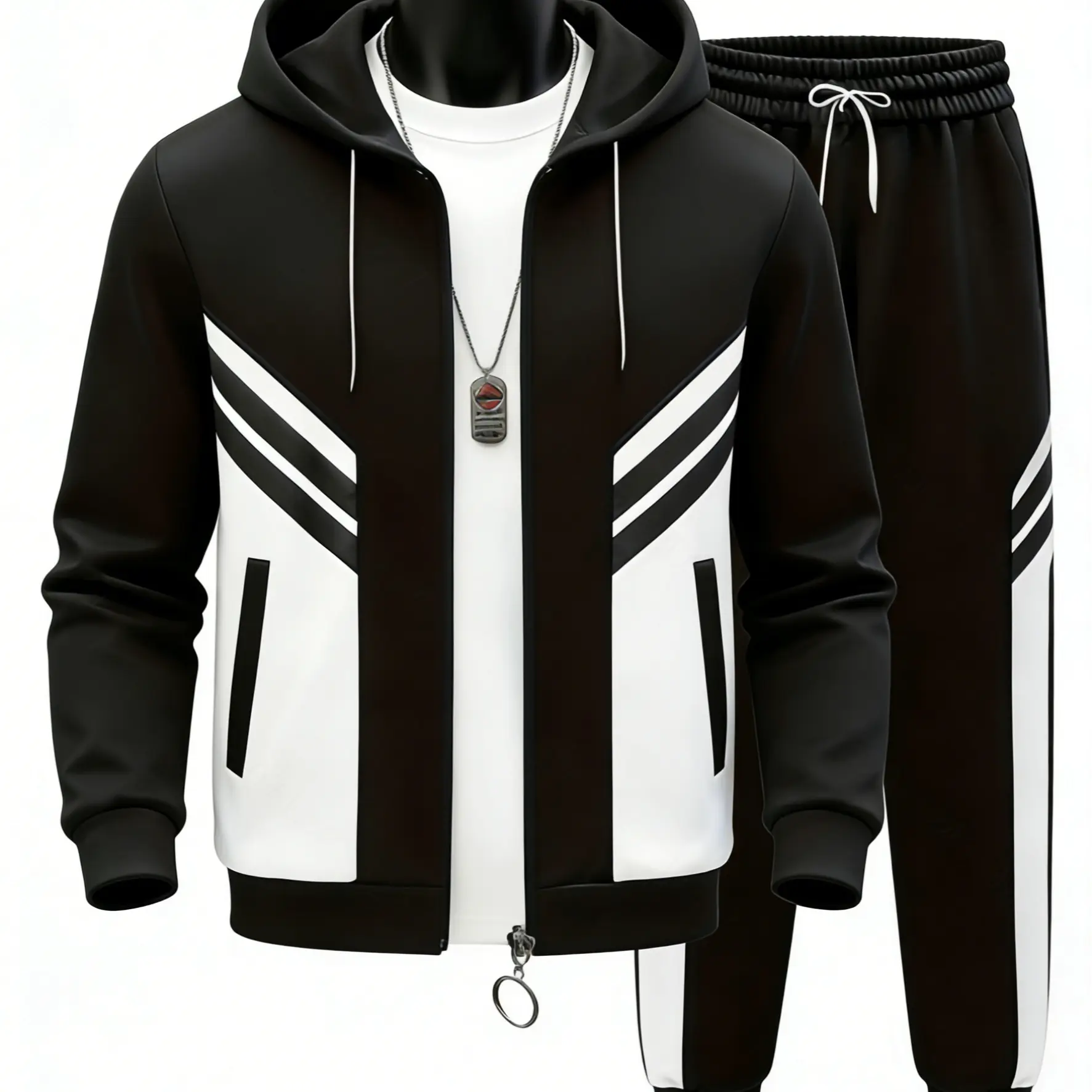 2026 New Men's Hooded Cardigan Two-Piece Set, Black and White Color-Block Striped Set, Zipper Hoodie Top + Jogger Pants, Trendy Patchwork Design, Perfect for Daily Wear, Casual Outings, and Commuting