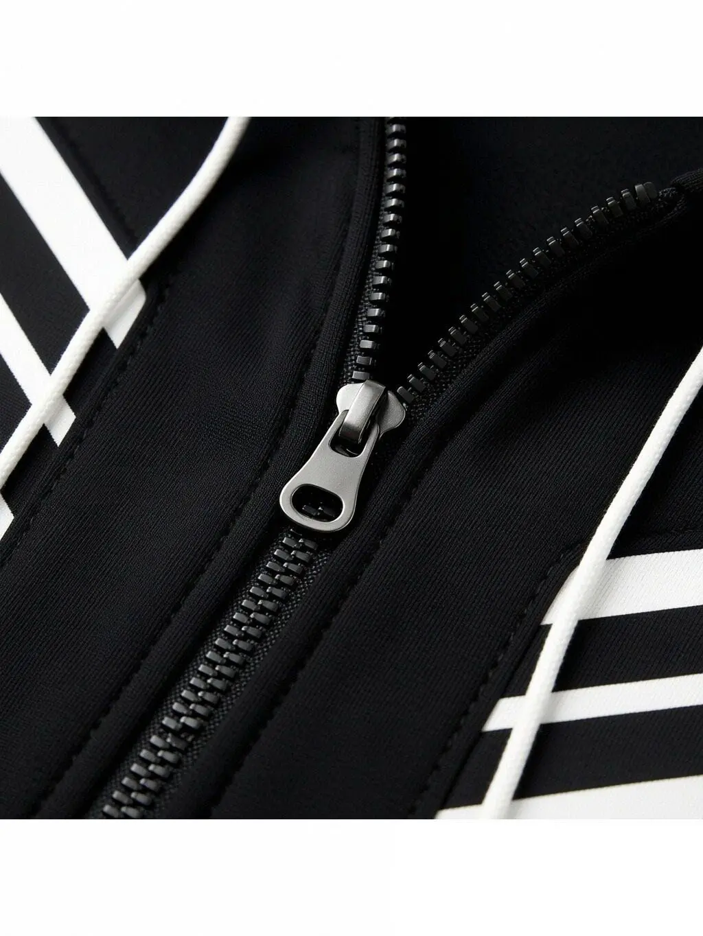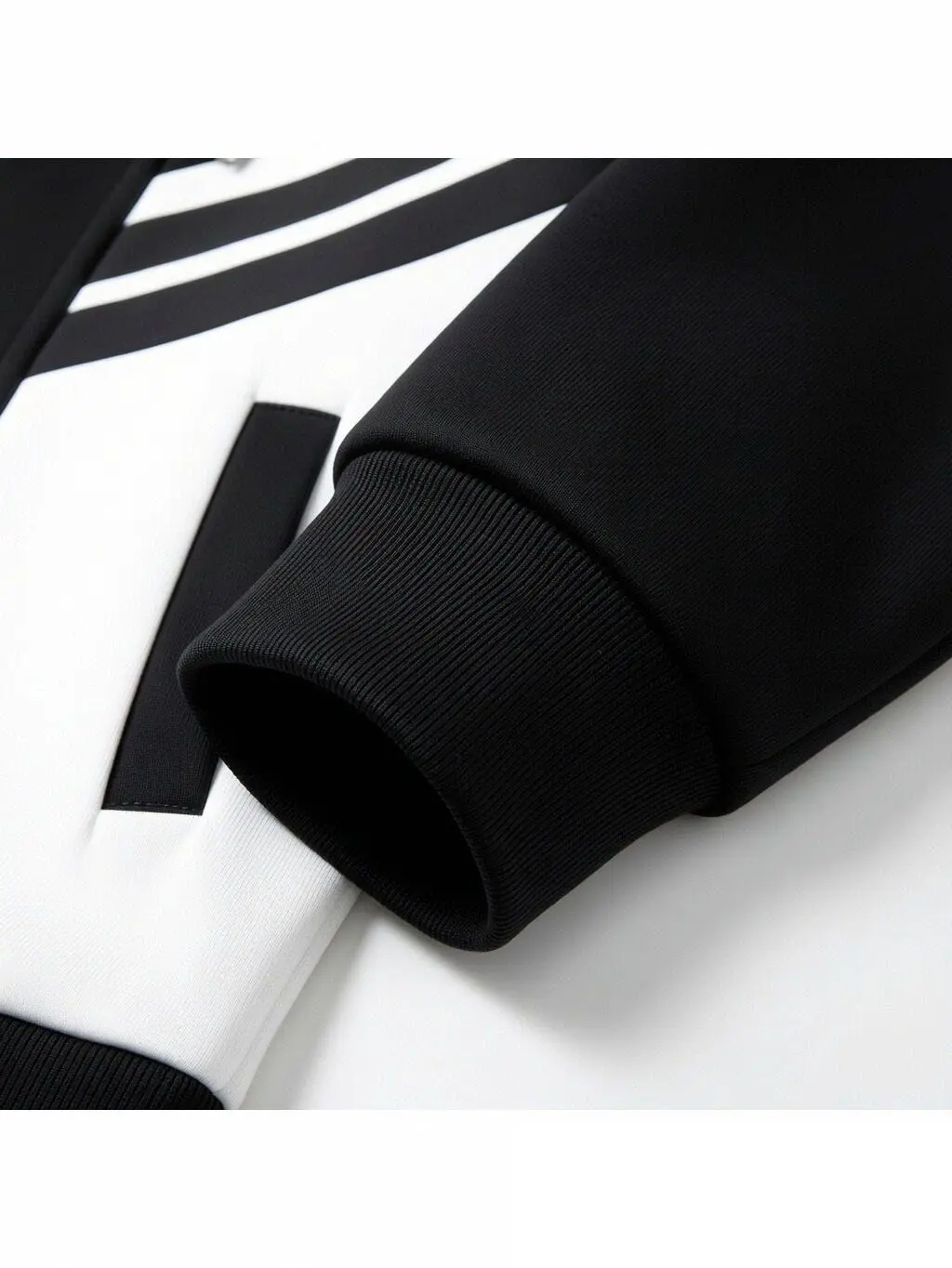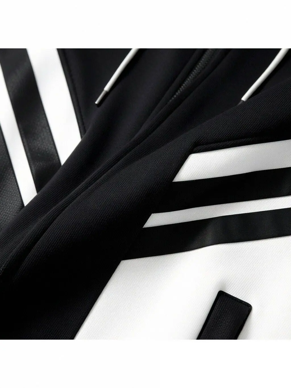 5. 2026 New Men's Hooded Cardigan Two-Piece Set, Black and White Color-Block Striped Set, Zipper Hoodie Top + Jogger Pants, Trendy Patchwork Design, Perfect for Daily Wear, Casual Outings, and Commuting