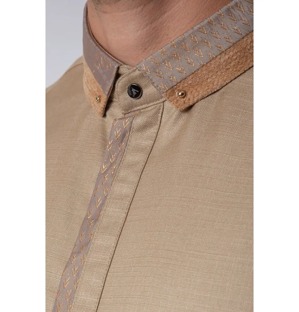 Men's Casual Full Length Islamic Thobe AAR2429 Golden Printed Arrows - Palm Sand This casual thobe is a blend of casual and religious attire. It has arrows printed in gold on a sateen trim that lines the hidden button closure and bordered by corduroy along the front upper chest creating an ultramodern look. This thobe is perfect for both casual and formal wear. COLOR: