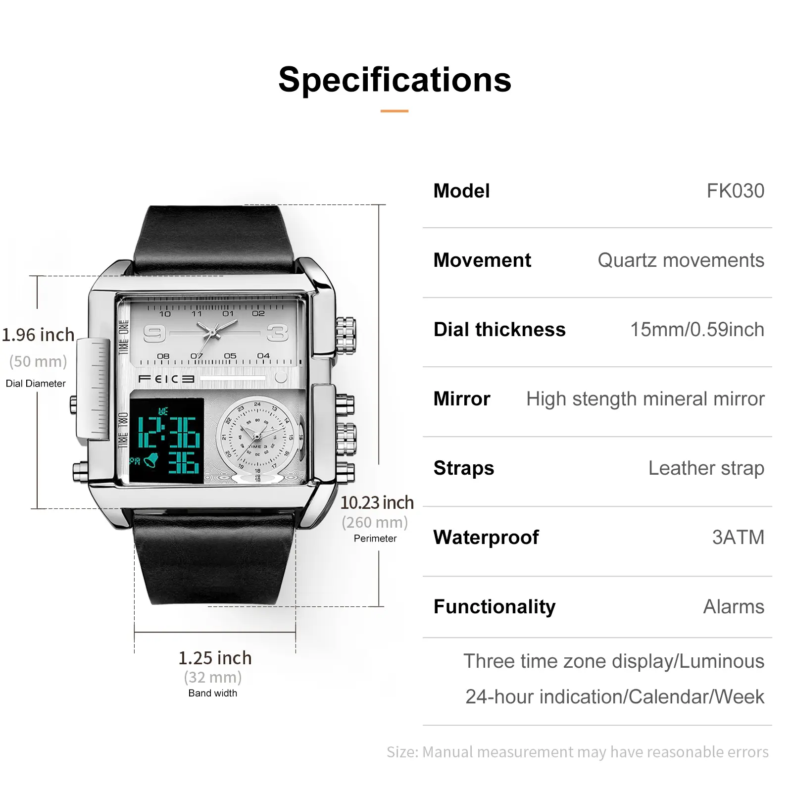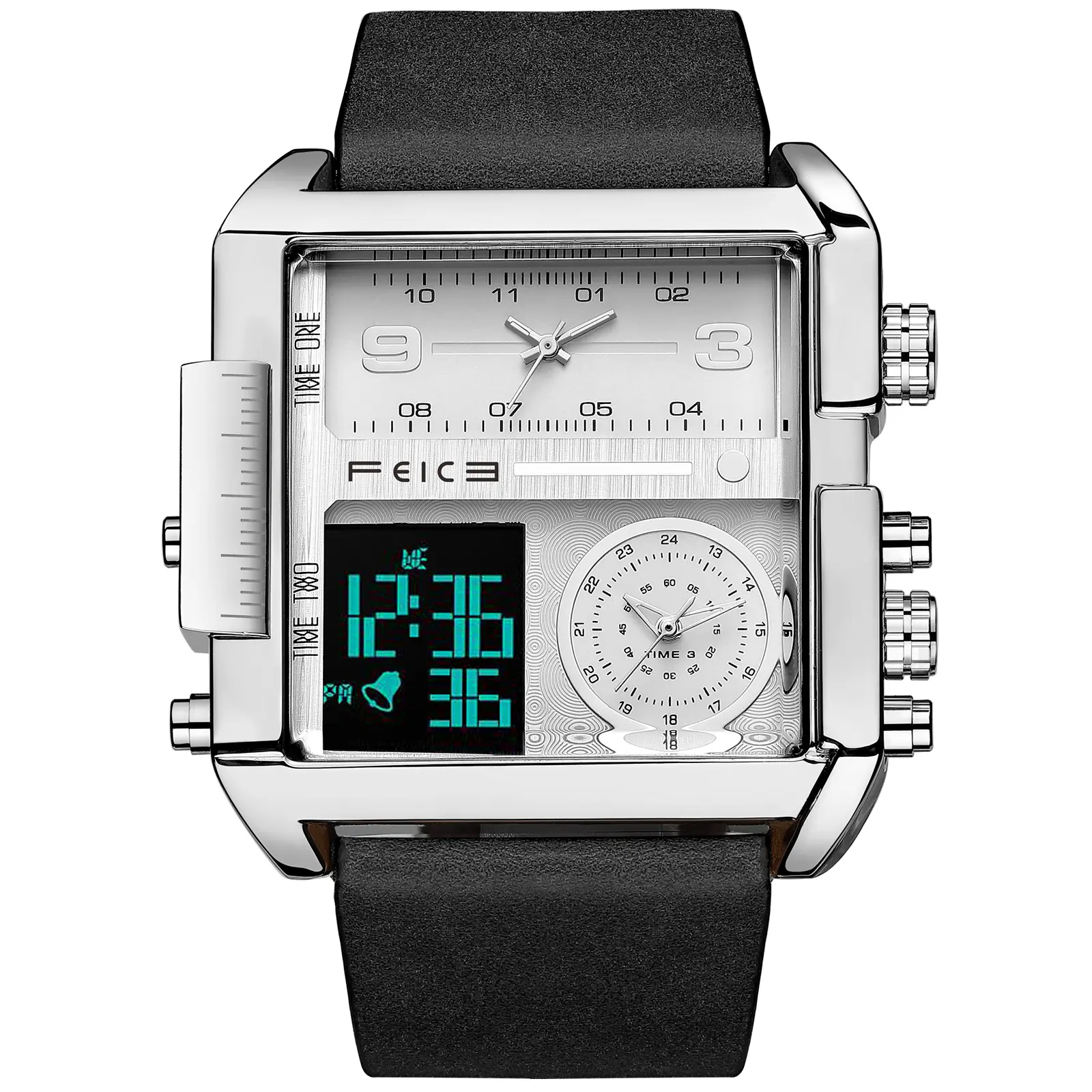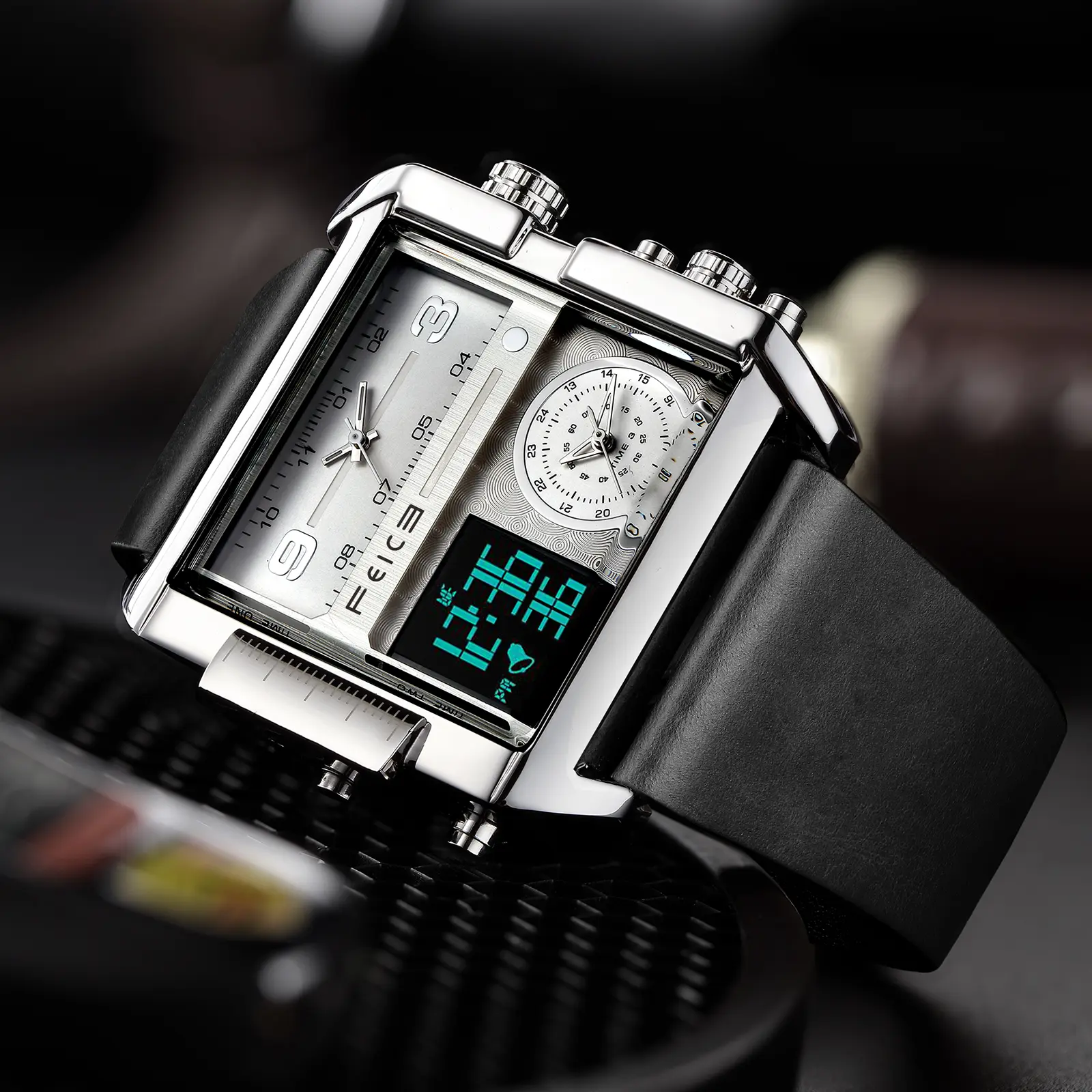 FEICE presents the FK030, a large dial square men's watch. It features a 50mm diameter and 15mm thickness, making it a bold statement. The watch includes a luminous dial and a multifunction chronograph. It's perfect for those who appreciate luxury and functionality.
