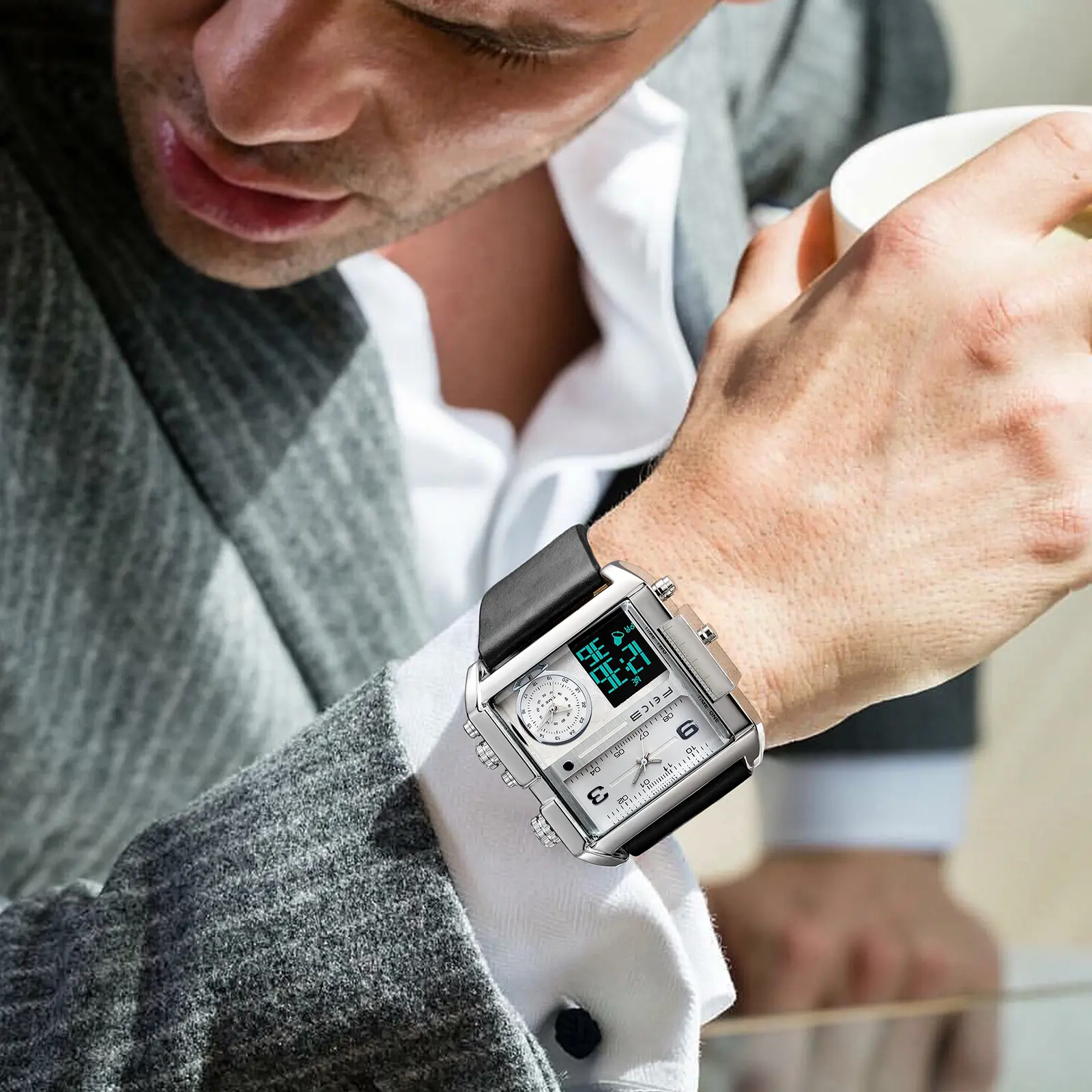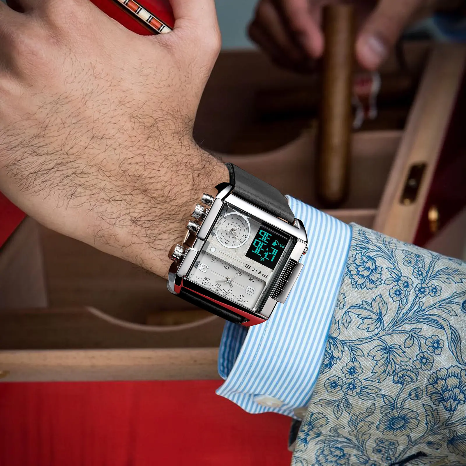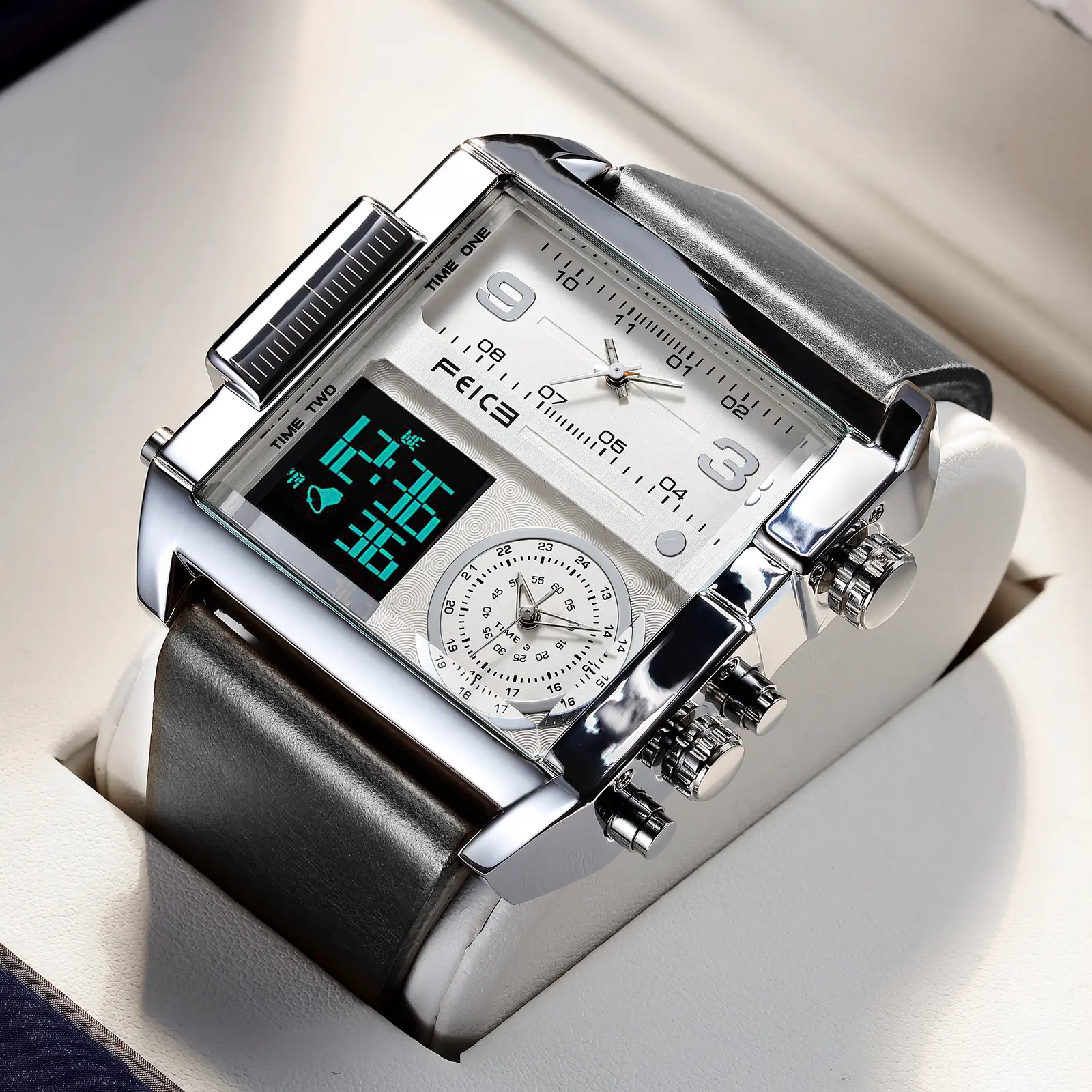 FEICE presents the FK030, a large dial square men's watch. It features a 50mm diameter and 15mm thickness, making it a bold statement. The watch includes a luminous dial and a multifunction chronograph. It's perfect for those who appreciate luxury and functionality.