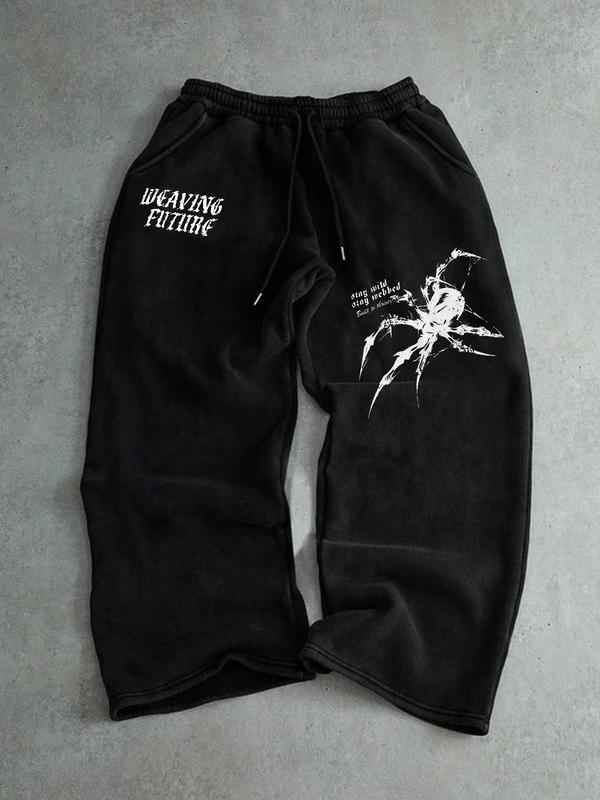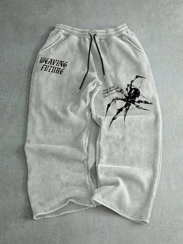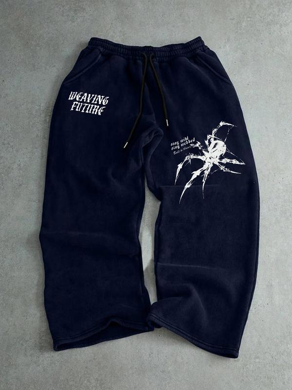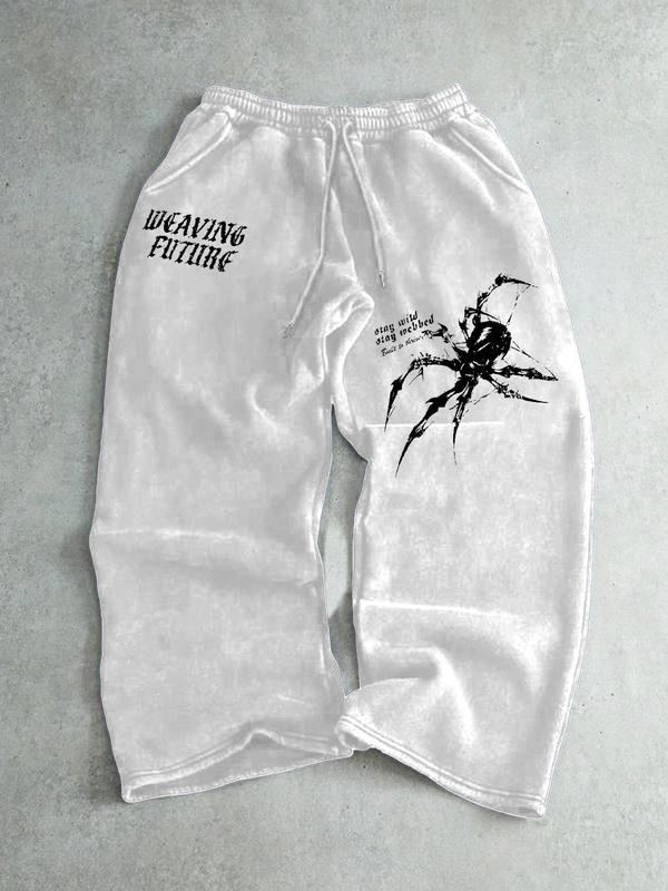 Men's Letter & Spider Print Drawstring Waist Loose Straight Leg Pants, Casual Lounge Pant, Casual Fall Winter Fitted Design, Multiple Colors Available