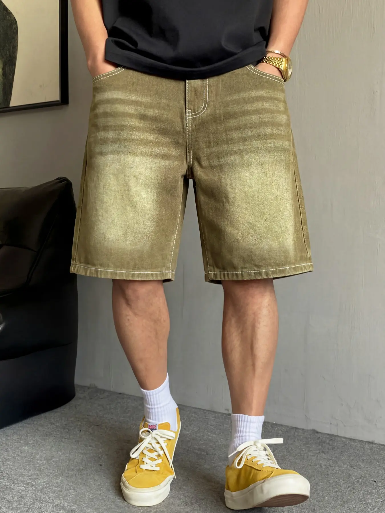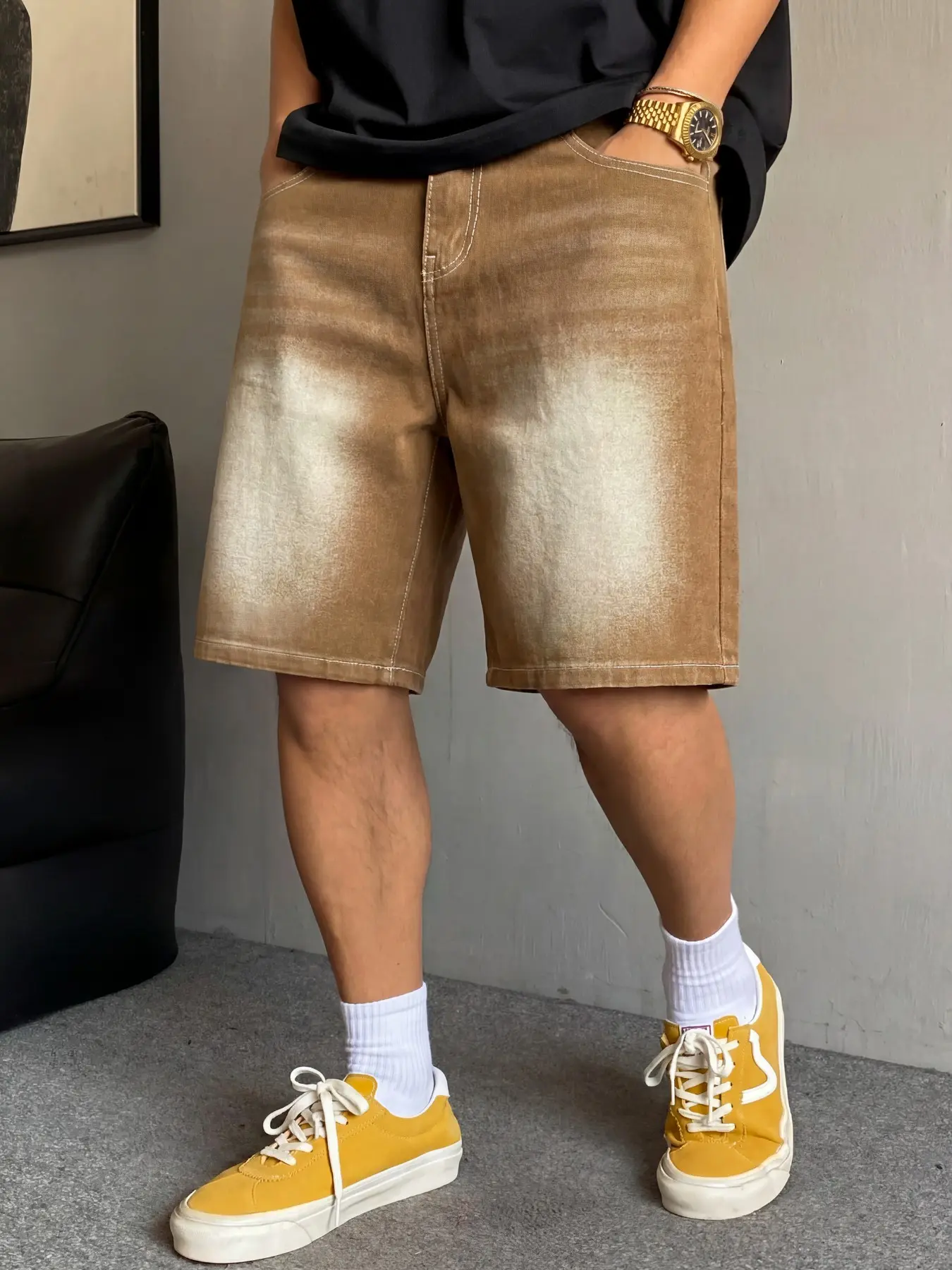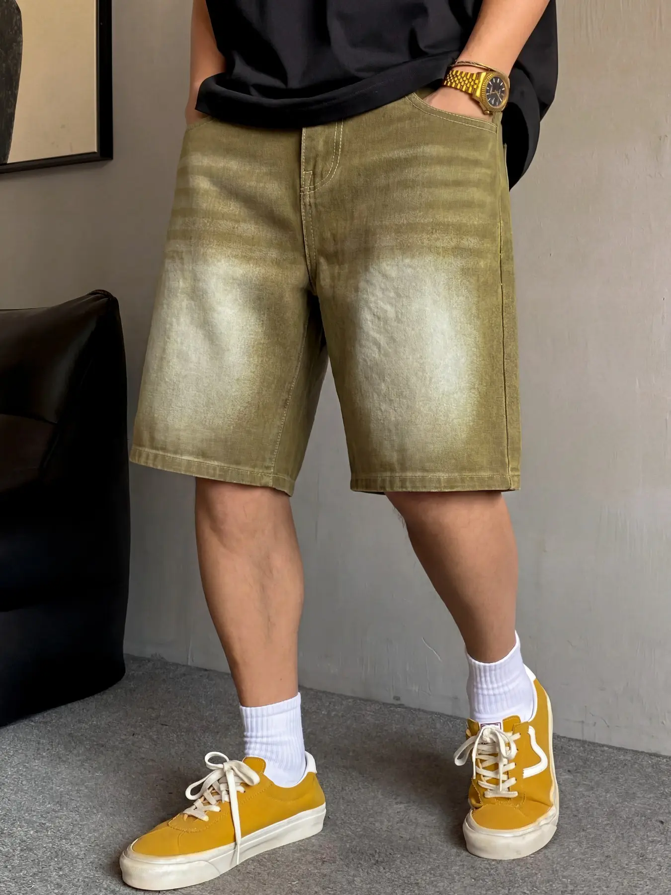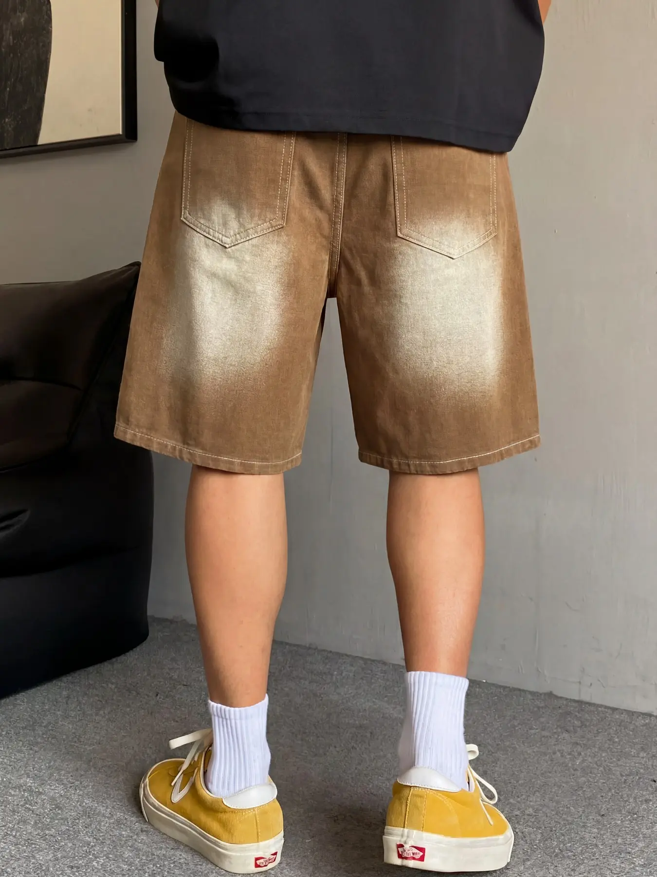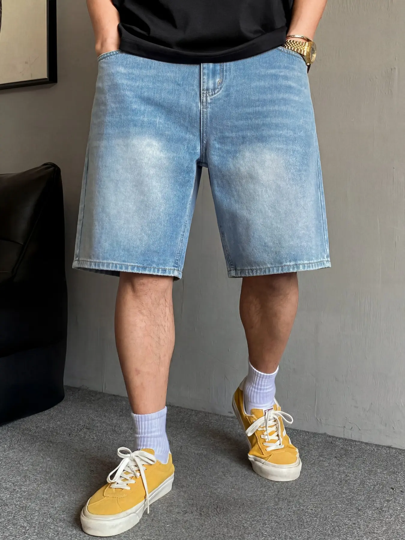5. Men's basic light blue washed straight-leg denim shorts, casual, versatile and comfortable. Non-stretchy denim shorts with a regular straight-leg fit. Those who prefer a loose fit can order one size larger.