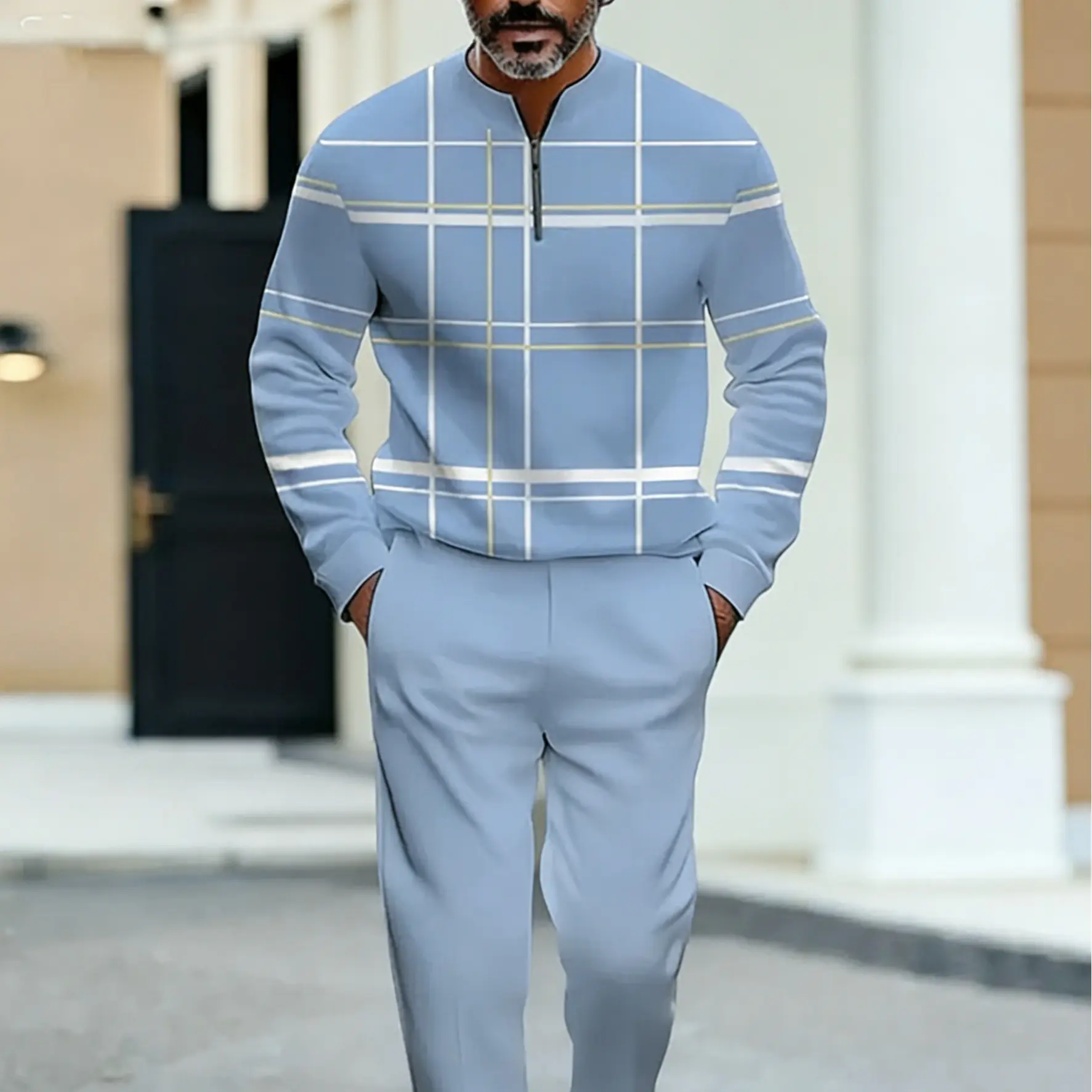 5. Men's 2-Piece Lightweight Business Casual Sportswear Set, Plaid Pattern Light Blue Half-Zip Top, Contrasting White-Yellow Plaid Matching Pants, Ideal for Urban Commuting & Office Leisure