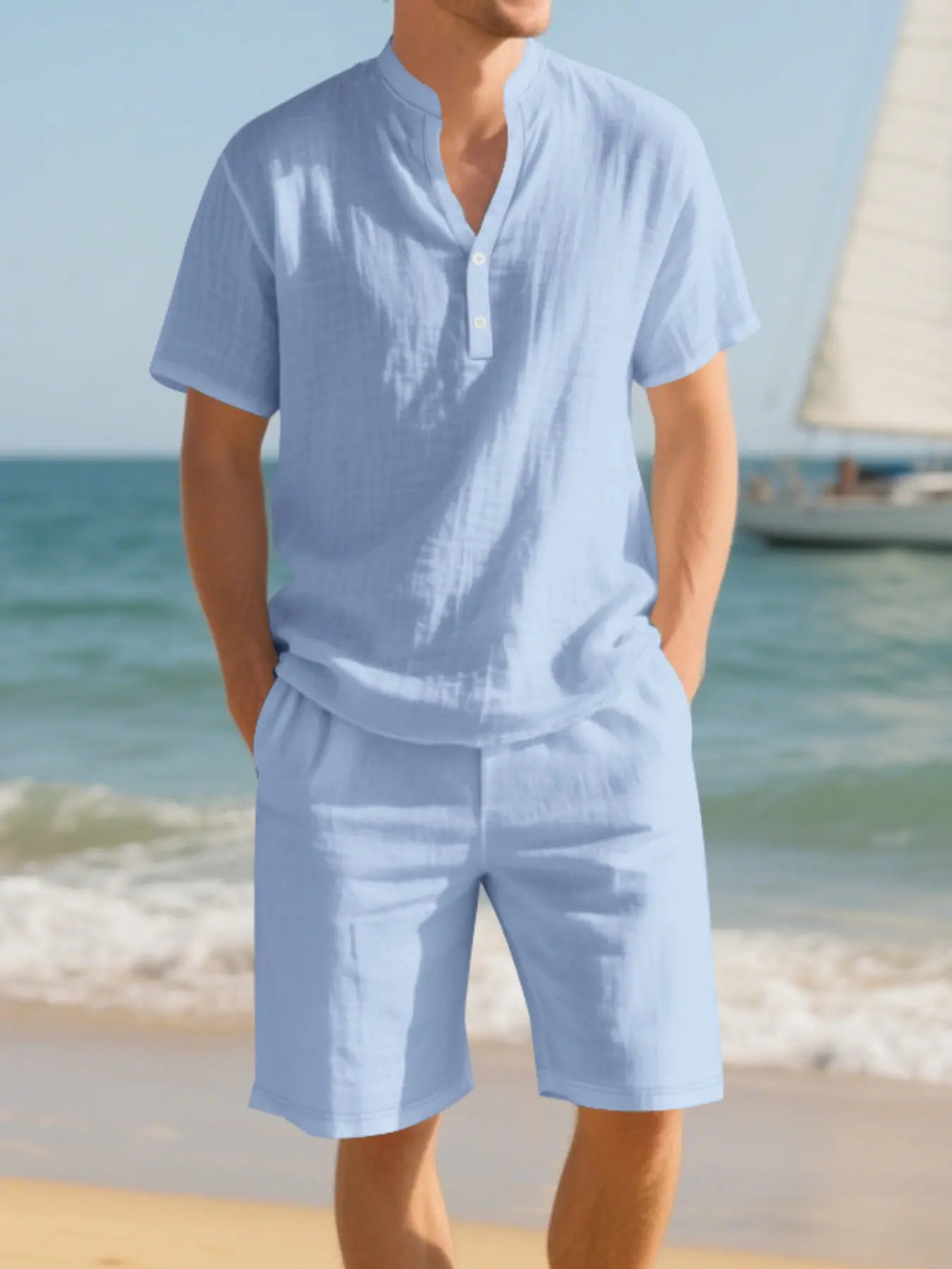 Men's Trendy Casual Linen 2-Piece Set, Henry Neck Shirt & Shorts, Summer Beach Vacation Style, Easy Match for Beach & Daily Wear