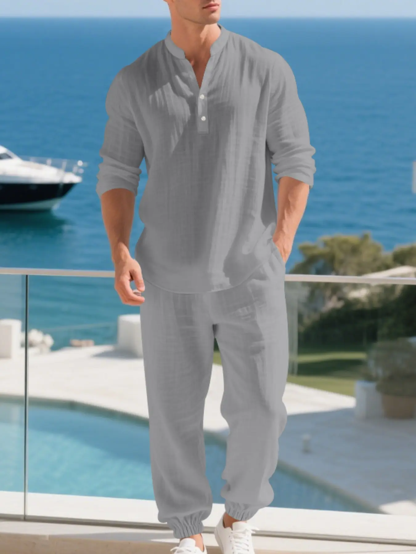 Men's Casual Long Sleeve Cuban Henley Shirt & Loose Pants Set, Beach Vacation, Comfortable Breathable Linen Fabric, Spring Summer Fashion #mensclothing #athleisuremen #breathablemenswear #unisexsweatsuits #usloungewearlooks #flatteringloungewear #mensuits #mensoutfitsideas #mensummerstyle #mensswimwear