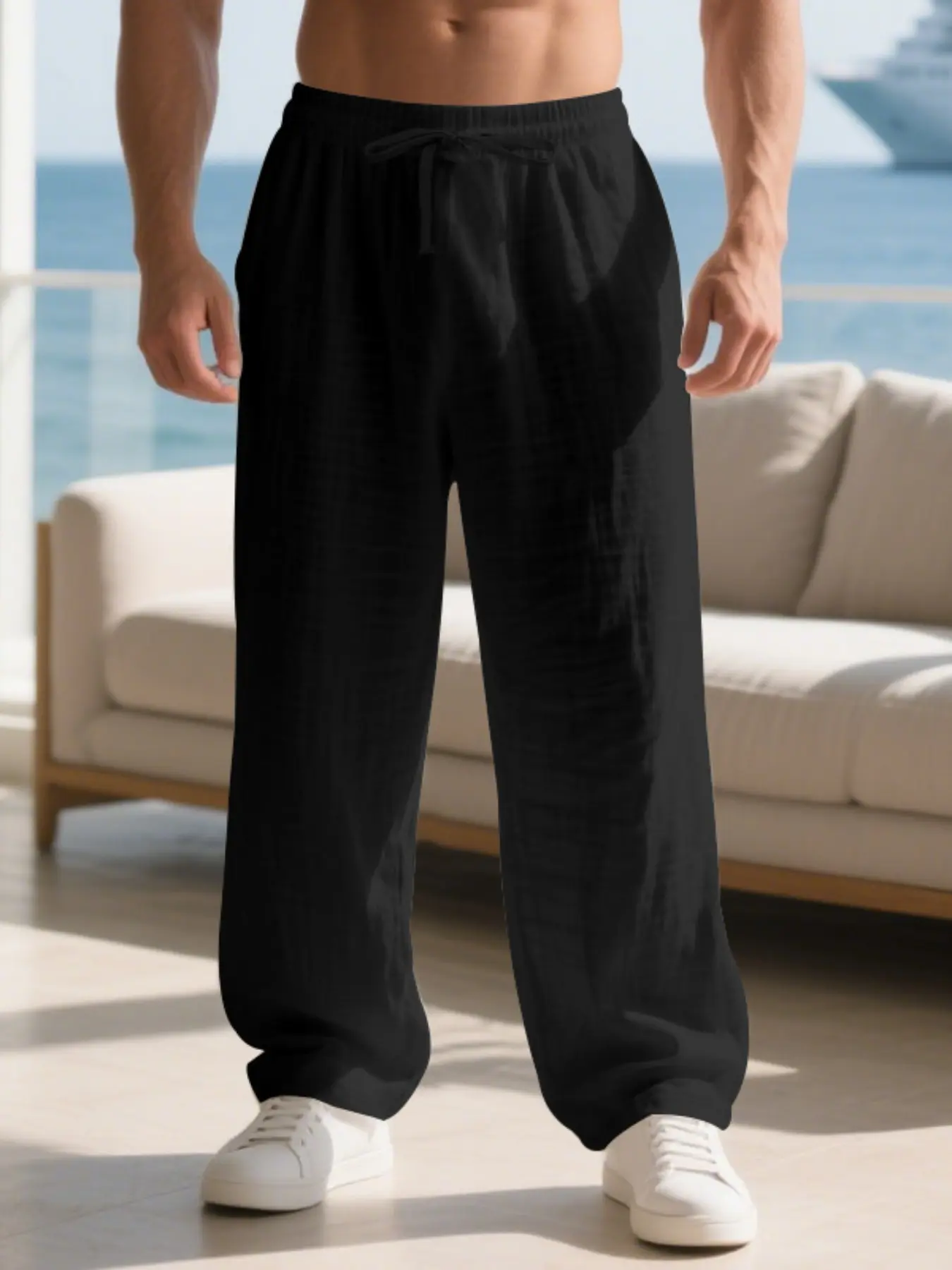 Men's Linen Long Pants Fit with Pockets, Casual Beach Pants, Summer Home Wear, Elastic Waistband & Drawstring, Spring & Fall Fashion