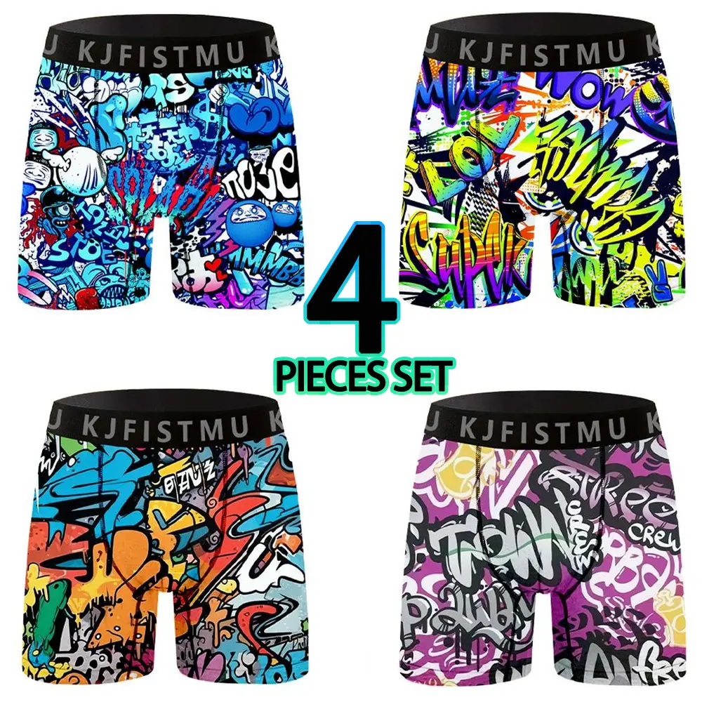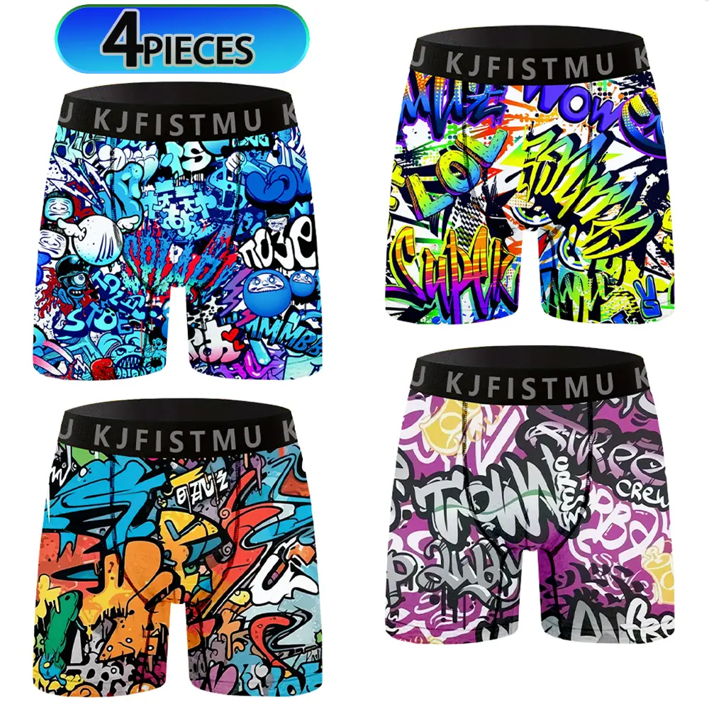 4-piece set of men's long printed boxer briefs, elastic and comfortable casual sports underwear, trendy graffiti-style prints, street style, breathable and thin fabric for sports, fitness, and daily wear Menswear Soft