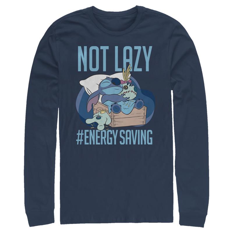 Ohana means family, and that means no tee gets left behind with this officially licensed Disney Lilo & Stitch Not Lazy, Energy Saving Men's Graphic Long Sleeve T-shirt! This adorable design features Stitch laying in his bed with a blanket and Scrump's ripped-off head next to him and the text "Not Lazy, #Energy Saving" printed across the front. Your popularity will skyrocket once you wear this new graphic tee, so grab one for yourself today!