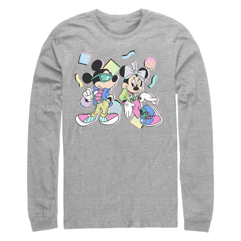 Who knew that dressing "mousey" could be so cute!? Celebrate Walt Disney's most iconic character with this officially licensed Mickey & Friends 80s Minnie and Micky Mouse Men's Long Sleeve T-Shirt, featuring Mickey and Minnie looking cool dressed in retro, groovy clothing across the front with colorful confetti and geometric shapes in the background. This graphic tee is perfect for the whole family, so grab one for yourself or a loved one today!