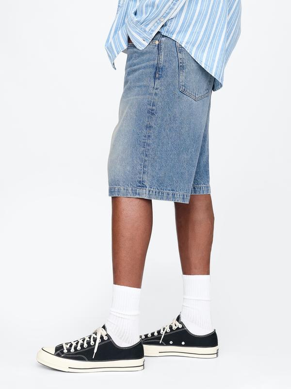 • Look: Five-pocket denim shorts in a medium wash.