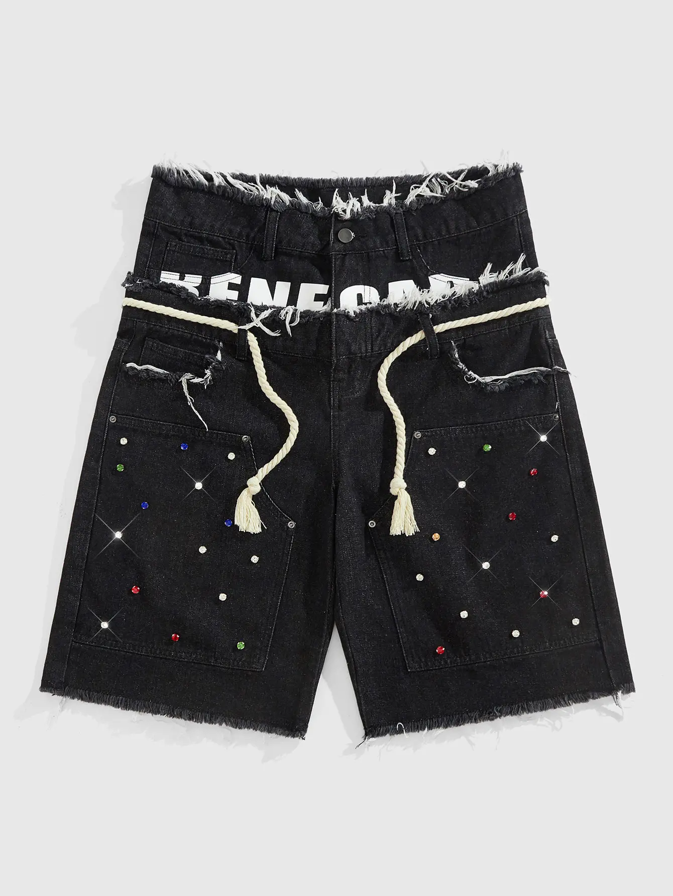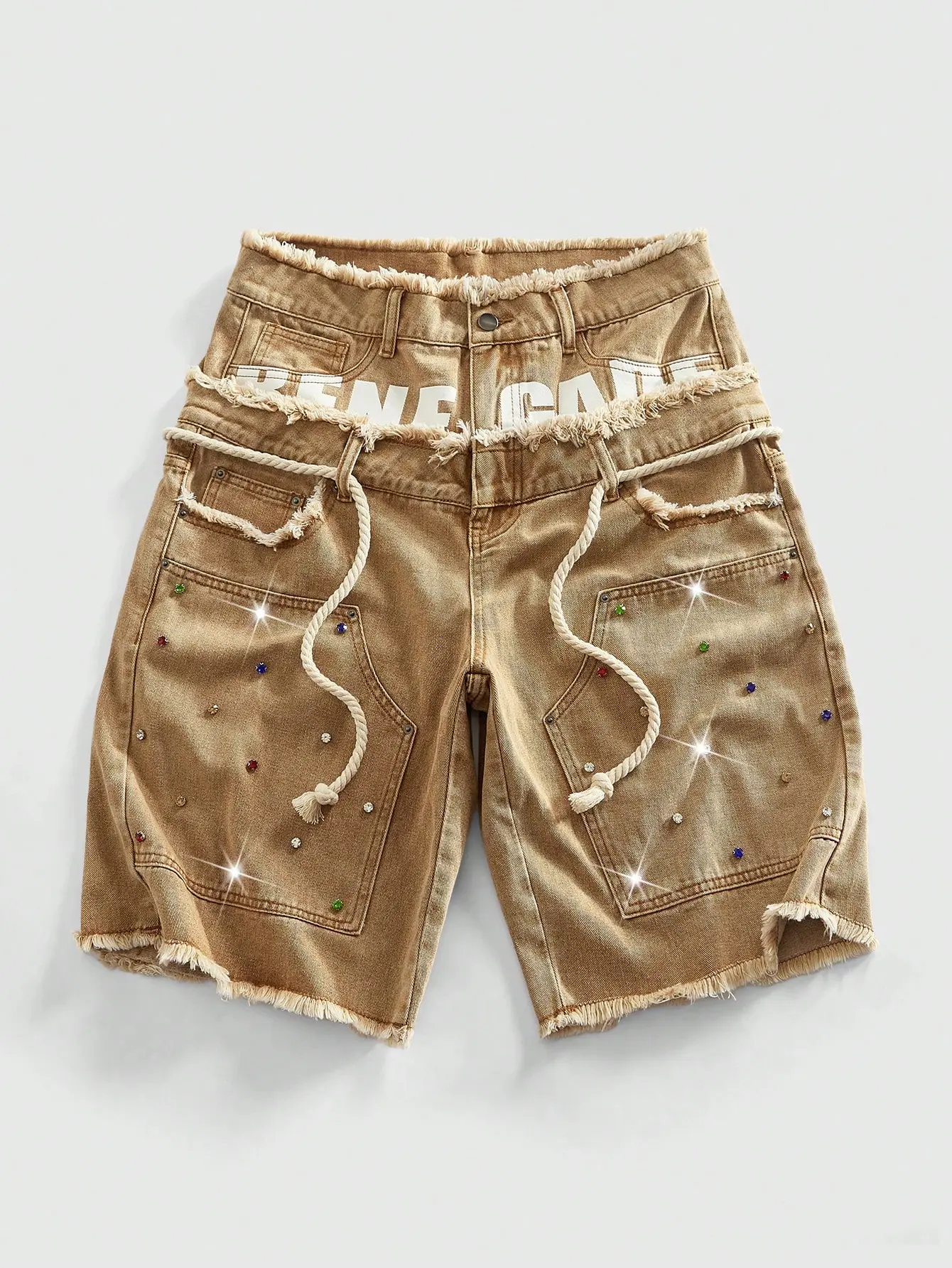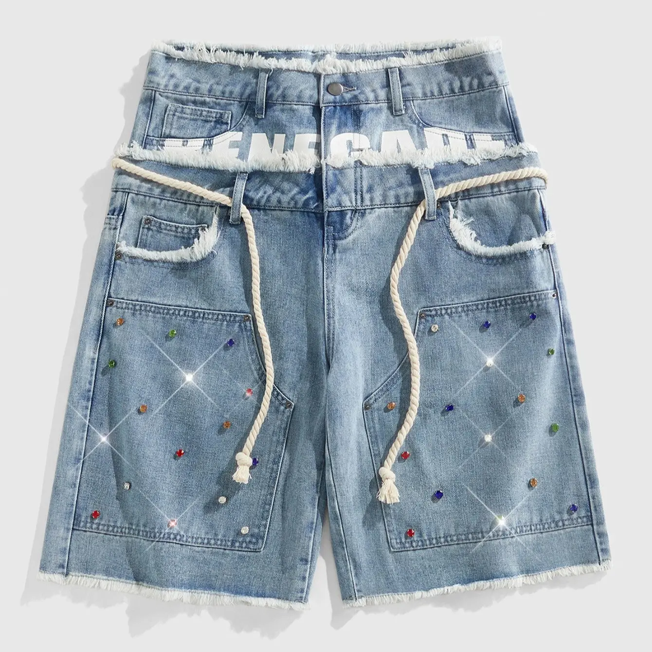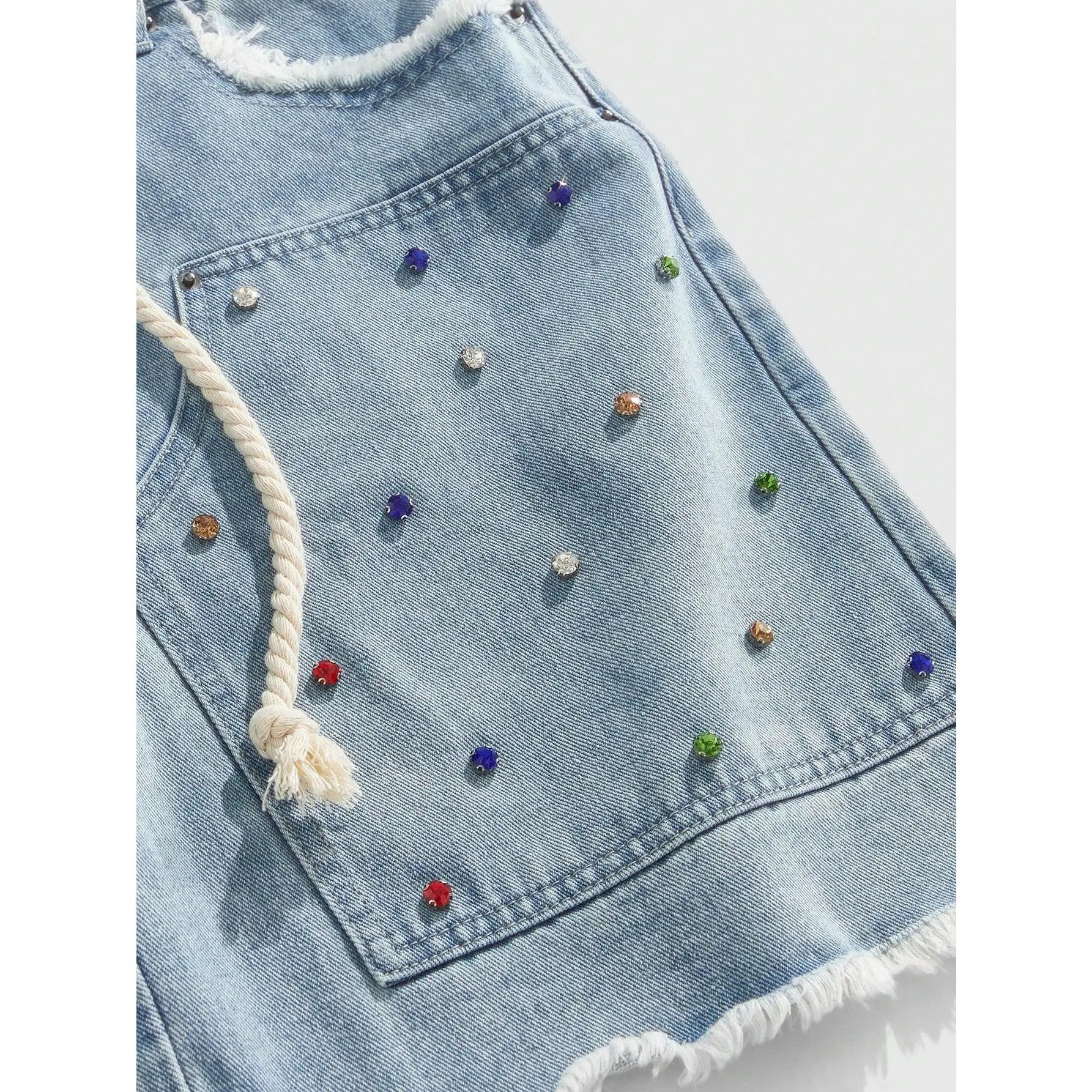 5. Glitter Rhinestone Streetstyle Loose Fit Double Layer Waist Diamond Embellished Denim Shorts