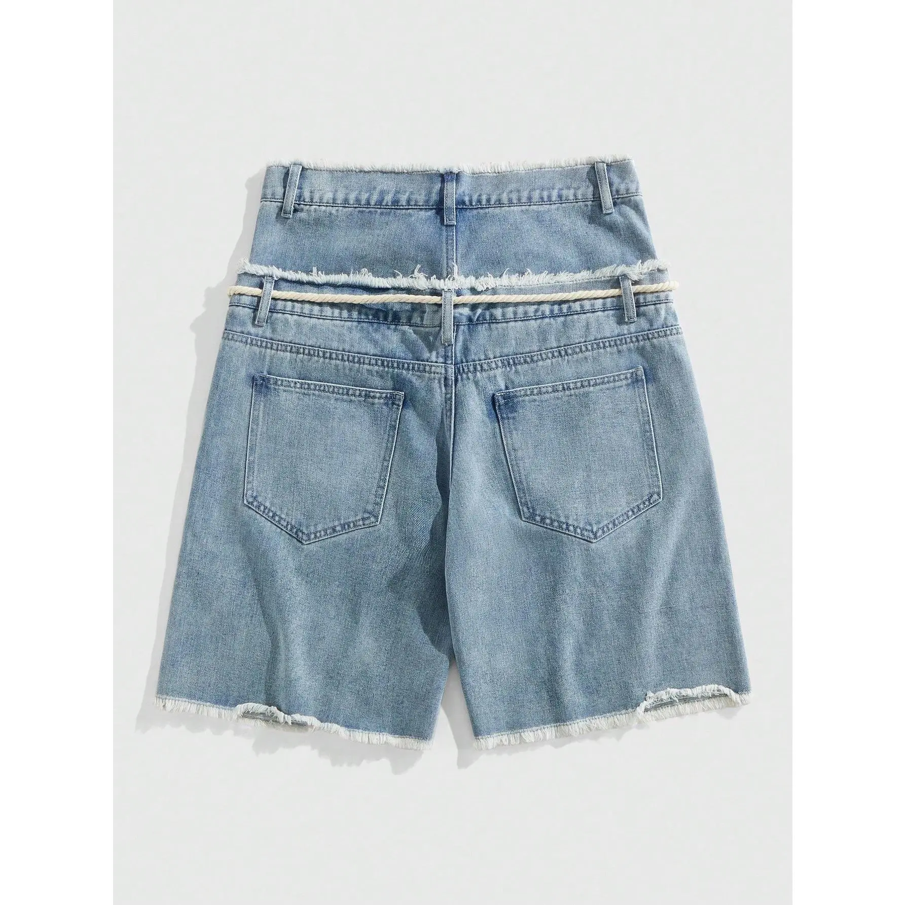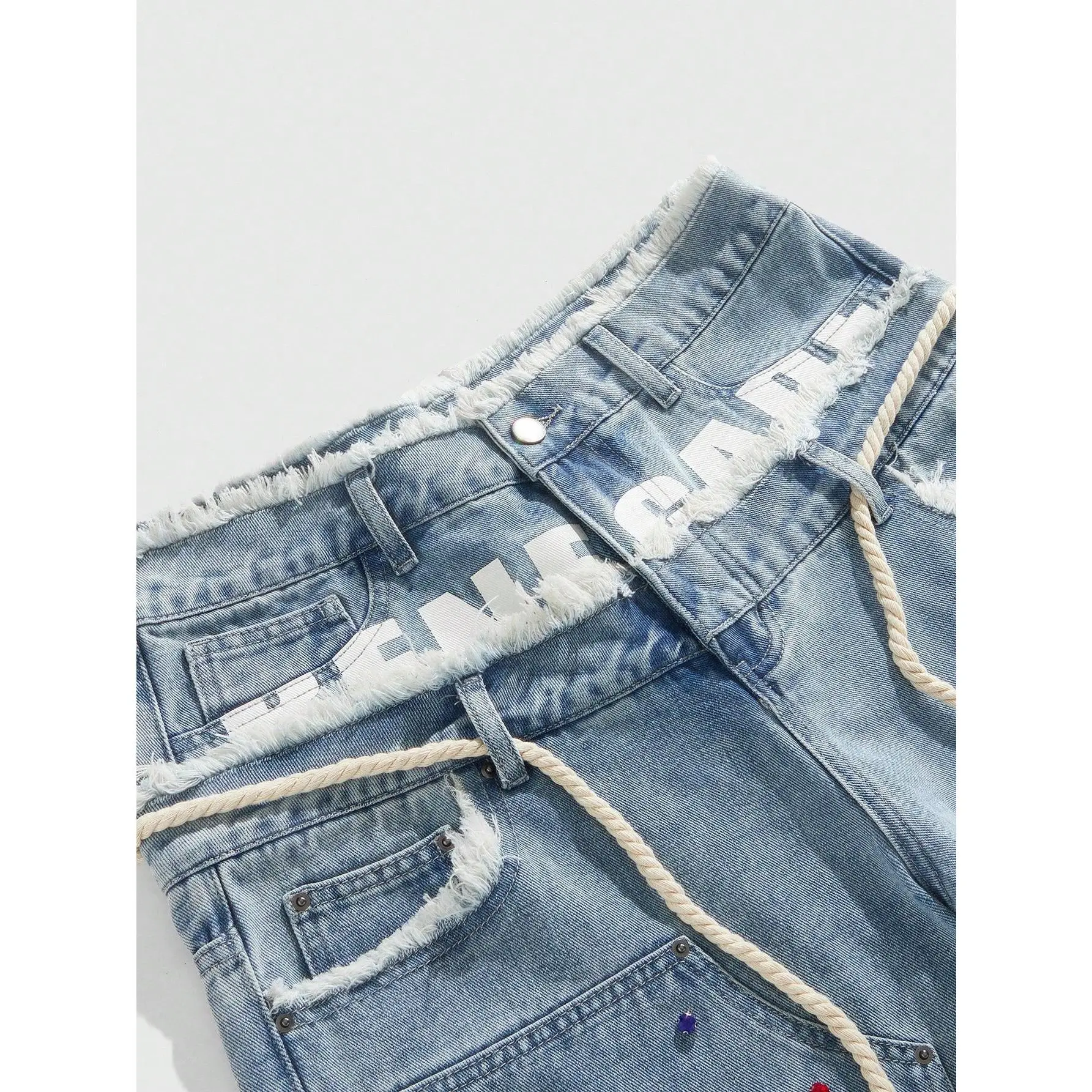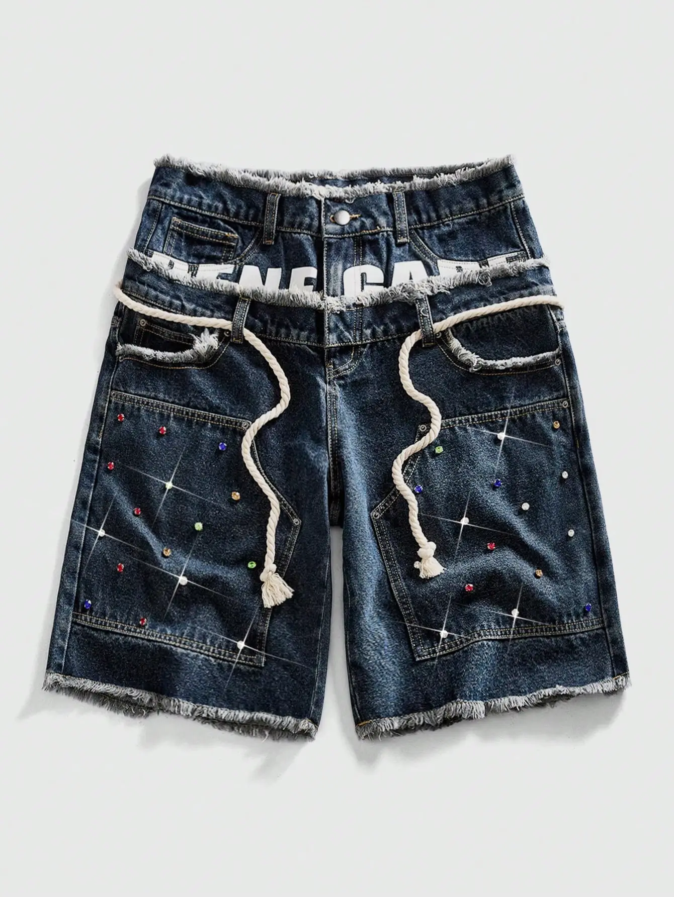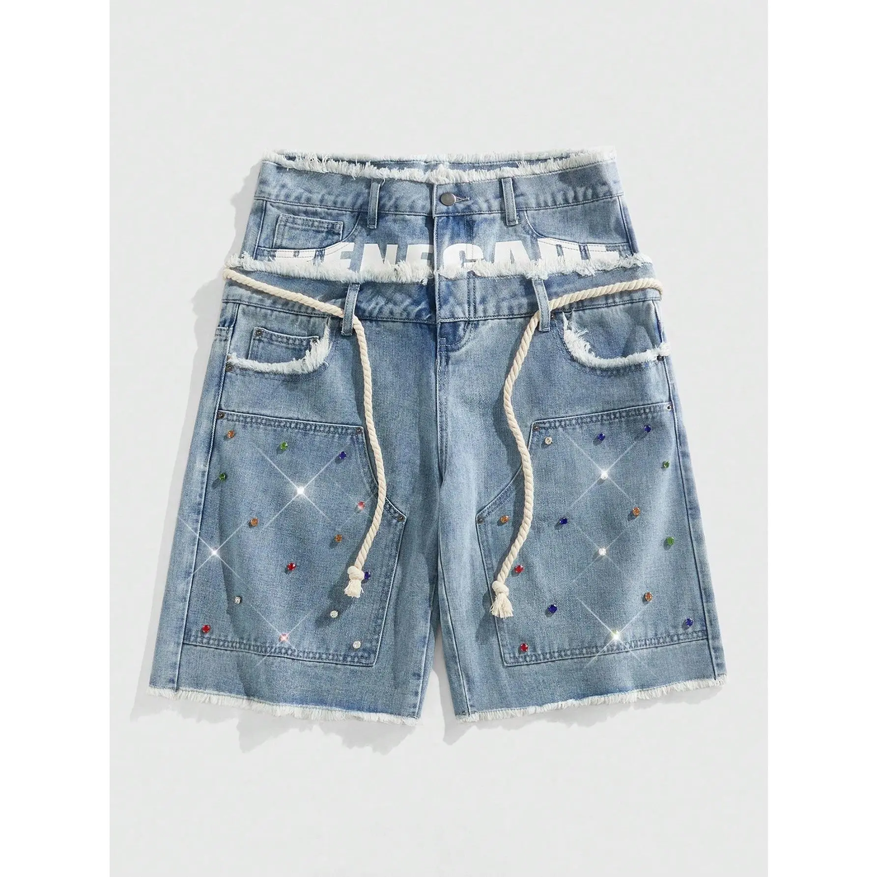 Glitter Rhinestone Streetstyle Loose Fit Double Layer Waist Diamond Embellished Denim Shorts