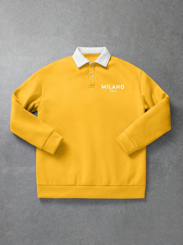 Men's Loose Fit Polo Collar Sweatshirt, Milano Print Long Sleeve Vacation Pullover, Perfect Gift for Friends Husband Boyfriend