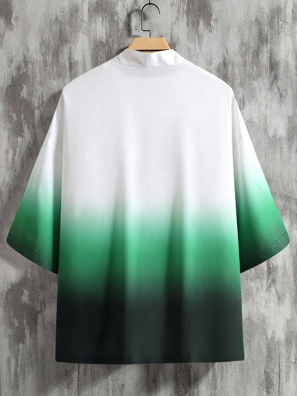Men's Loose Ombre Kimono with Japanese Letter Graphic, Casual Style, Moderate Fabric, Perfect Gift for Boyfriend, Summer Wear #unisexgraphictee #oversizedtee #mensstyleinspo #teeshirts #menshapewear #animeclothing #menshirts #athleisuremen #cardigans #wrapshirt