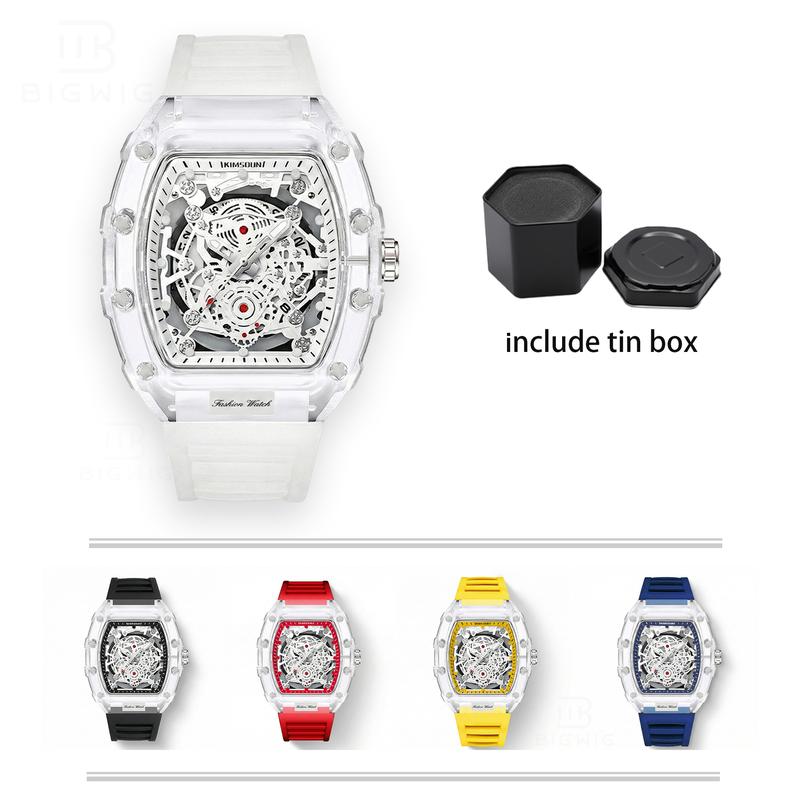 The watch features luminous markers and hands, making it easy to read the time in low-light conditions. The clear barrel-shaped tonneau design allows you to appreciate the intricate mechanics of the quartz movement. Built with waterproof construction, it protects against splashes and brief immersion in water. Ideal for daily use, it ensures your watch remains safe and functional.
