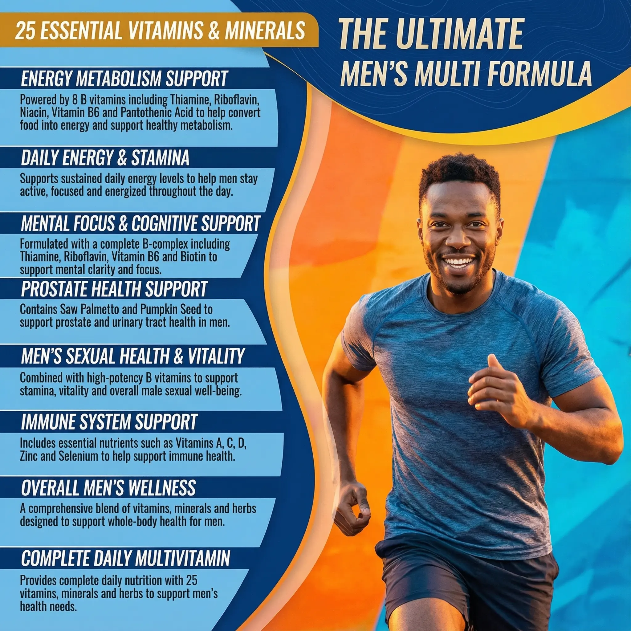 ·Powerful Nutrients: Key nutrients for men are chosen specifically to support powerful athletic performance, stamina, and body wellbeing.