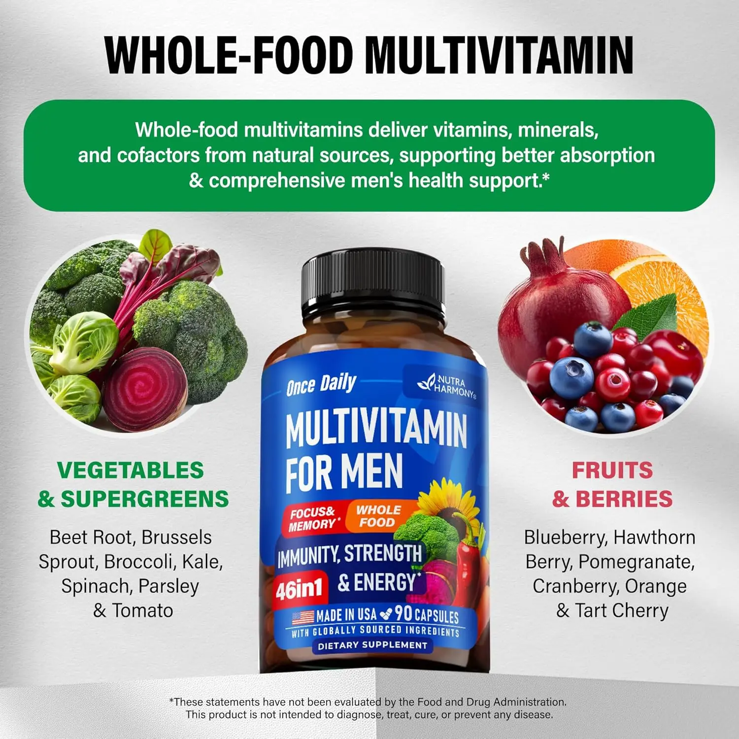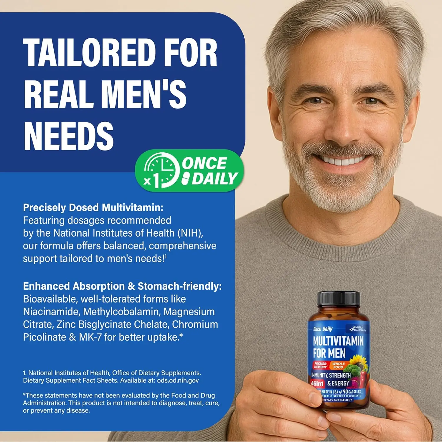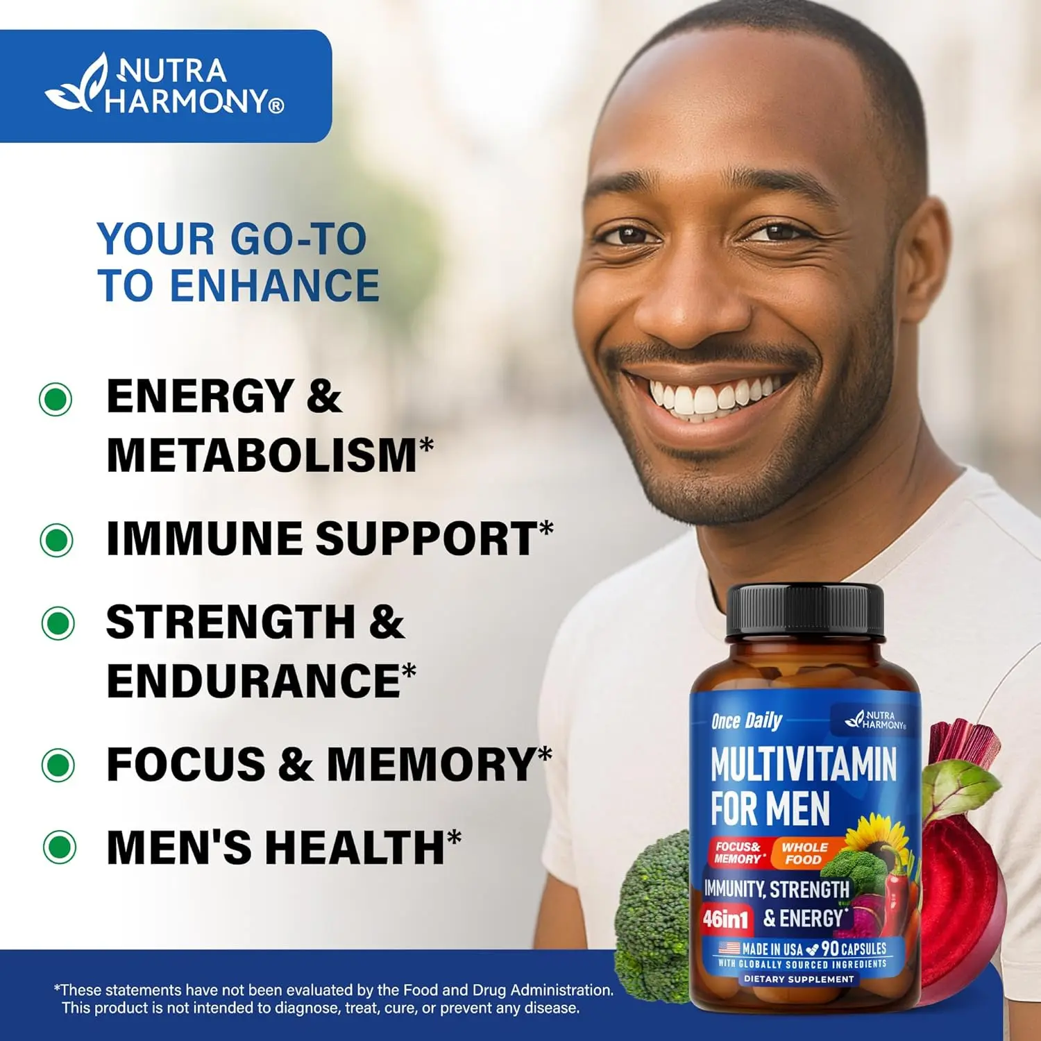 ·Made in USA & Quality Assured — our men’s vitamins multivitamin capsules are proudly made in the USA with globally sourced ingredients, following strict quality standards. Non-GMO and GMP certified, delivering maximum potency and purity. At NUTRAHARMONY, we ensure scientifically formulated men’s multivitamins & exceptional service you can trust for your wellness journey!