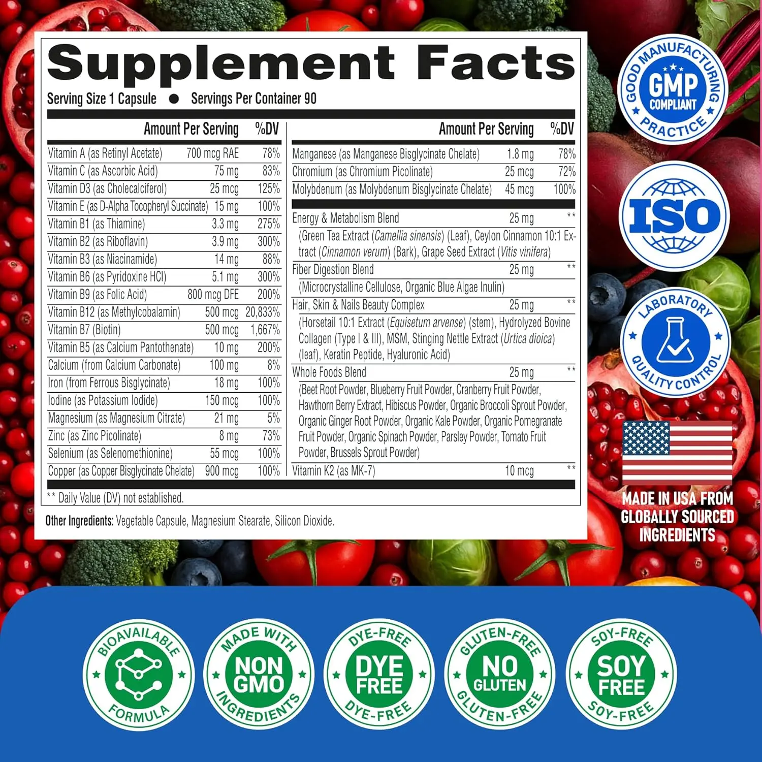 Vitamin A (as Retinyl Acetate), Vitamin C (as Ascorbic Acid), Vitamin D3 (as Cholecalciferol), Vitamin E (as D-Alpha Tocopheryl Succinate), Vitamin B1 (as Thiamine), Vitamin B2 (as Riboflavin), Vitamin B3 (as Niacinamide), Vitamin B6 (as Pyridoxine HCI), Vitamin B9 (as Folic Acid), Vitamin B12 (as Methylcobalamin), Vitamin B7 (Biotin), Vitamin B5 (as Calcium Pantothenate), lodine (as Potassium lodide, Magnesium (as Magnesium Citrate), Zinc (as Zinc Bisglycinate Chelate), Selenium (as Selenomethionine), Copper (as Copper Bisglycinate Chelate), Manganese (as Manganese Bisglycinate Chelate), Chromium (as Chromium Picolinate), Molybdenum (as Molybdenum Bisglycinate Chelate). Whole Foods Blend (Beet Root Powder, Blueberry Fruit Powder, Brussels Sprout Powder, Hawthorn Berry Extract, Organic Broccoli Sprout Powder, Organic Kale Powder, Organic Pomegranate Powder, Organic Spinach Powder, Parsley Powder, Tomato Fruit Powder, Cranberry Fruit Powder, Orange Fruit Powder, Tart Cherry Extract). Concentration Blend (Lion's Mane Powder, Alpha GPC, Phosphatidylerine (from sunflower)). Energy Blend (Green Tea Extract (Camellia sinensis) (Leaf), Ashwagandha Powder, Panax Ginseng Powder). Men's Blend (Saw Palmetto Powder, Pumpkin Seed Powder, Stinging Nettle Extract (Urtica dioica) (Leaf)). Enzyme Blend (Betaine Anhydrous, Papain 2000 USP, Bromelain 2400 GDU), Vitamin K2 (as MK-7). Other Ingredients: Vegetable Capsule, Magnesium Stearate, Silicon Dioxide.