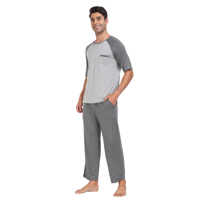 ·Mens Pajama Sets Desigin:Sleep Bottom Shorts two side pockets, elastic waistband and adjustable drawstring. Without Open fly front ,make your moving freely.Sleep Top: short sleeves craw neck design and with the Patchwork color Pockets ,this design is classic,make more relaxed wearing them.