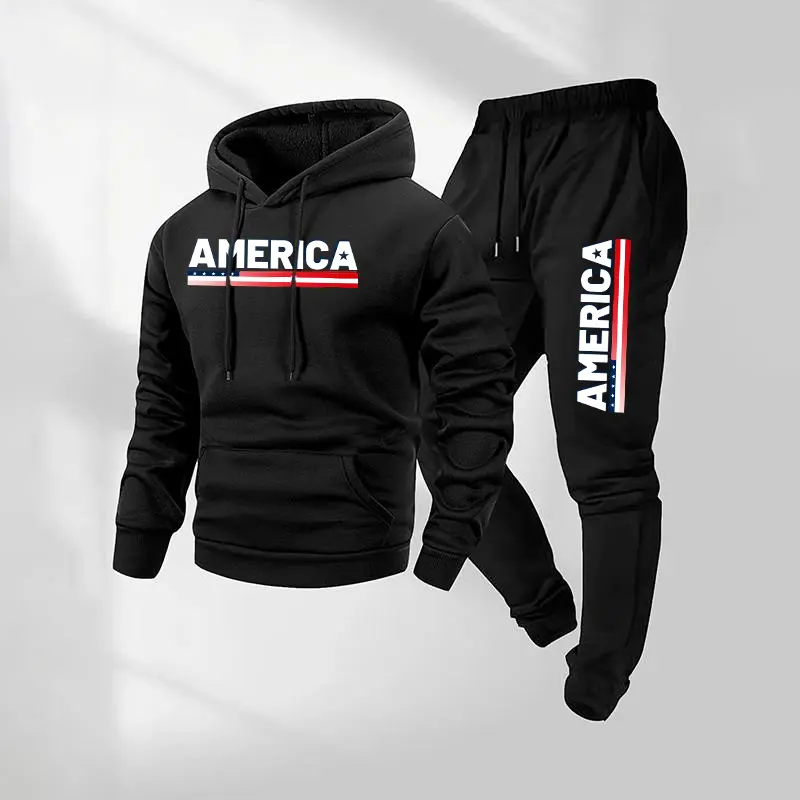 Men's AMERICA Letter Printed Hoodie & Drawstring Sweatpants Set