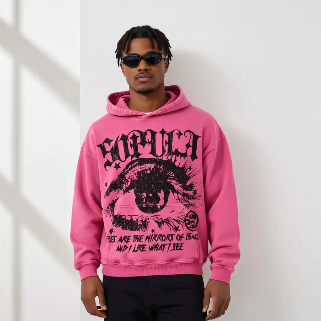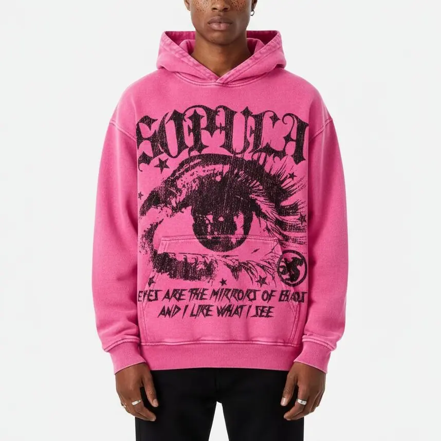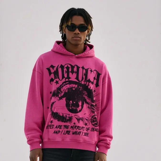 Sopula Studio Men's Star Eyes Graphic Acid Wash Hoodie Menswear Sweatshirts Pink 100% Cotton Long Sleeve Casual Pullover Tops SpringStatements