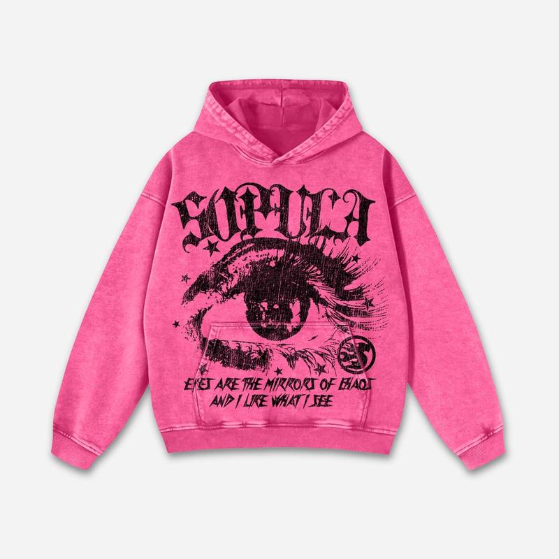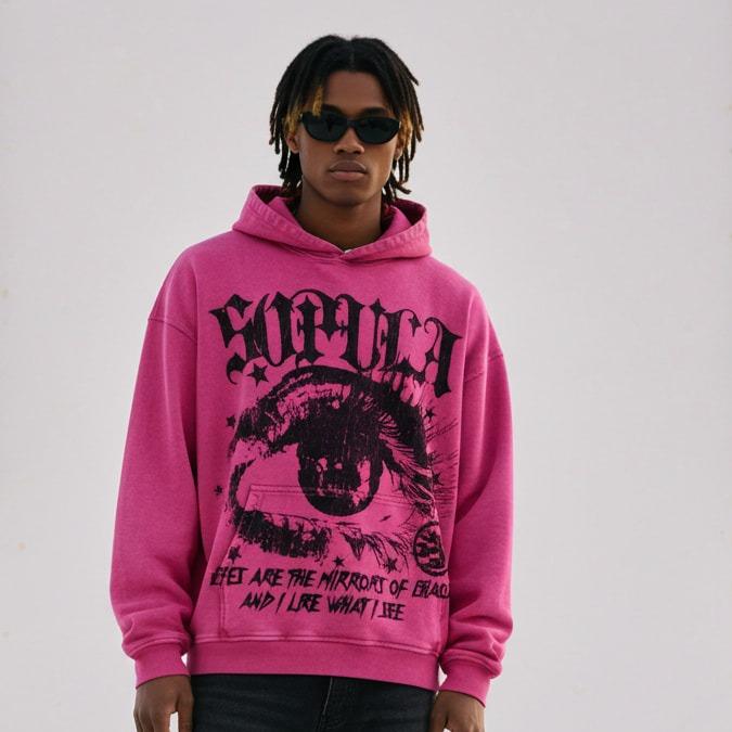 Sopula Studio Men's Star Eyes Graphic Acid Wash Hoodie Menswear Sweatshirts Pink 100% Cotton Long Sleeve Casual Pullover Tops