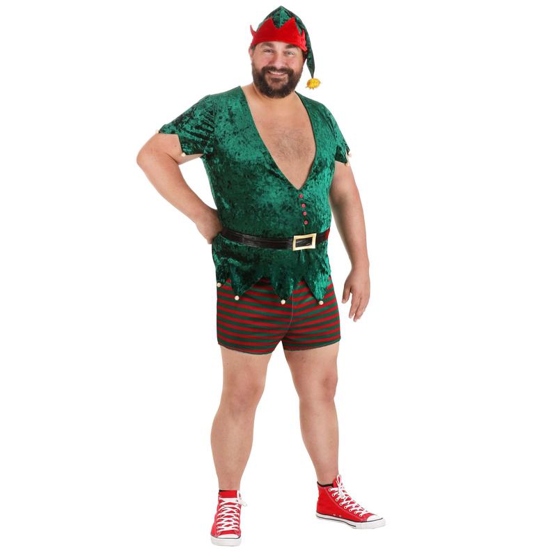 Look nice with more than a hint of naughty when you wear this exclusive Plus Size Sexy Christmas Elf Costume for Men! The stretchy pullover tunic is made of rich green velvet and features a deep V neckline above four decorative red buttons. Its zig-zag hemline is tipped with tiny pom-poms. A black faux leather belt with a gold-tone fabric buckle secures around your waist. The stretchy short shorts are patterned with red and green stripes. Top it all off with the red and green elf hat!