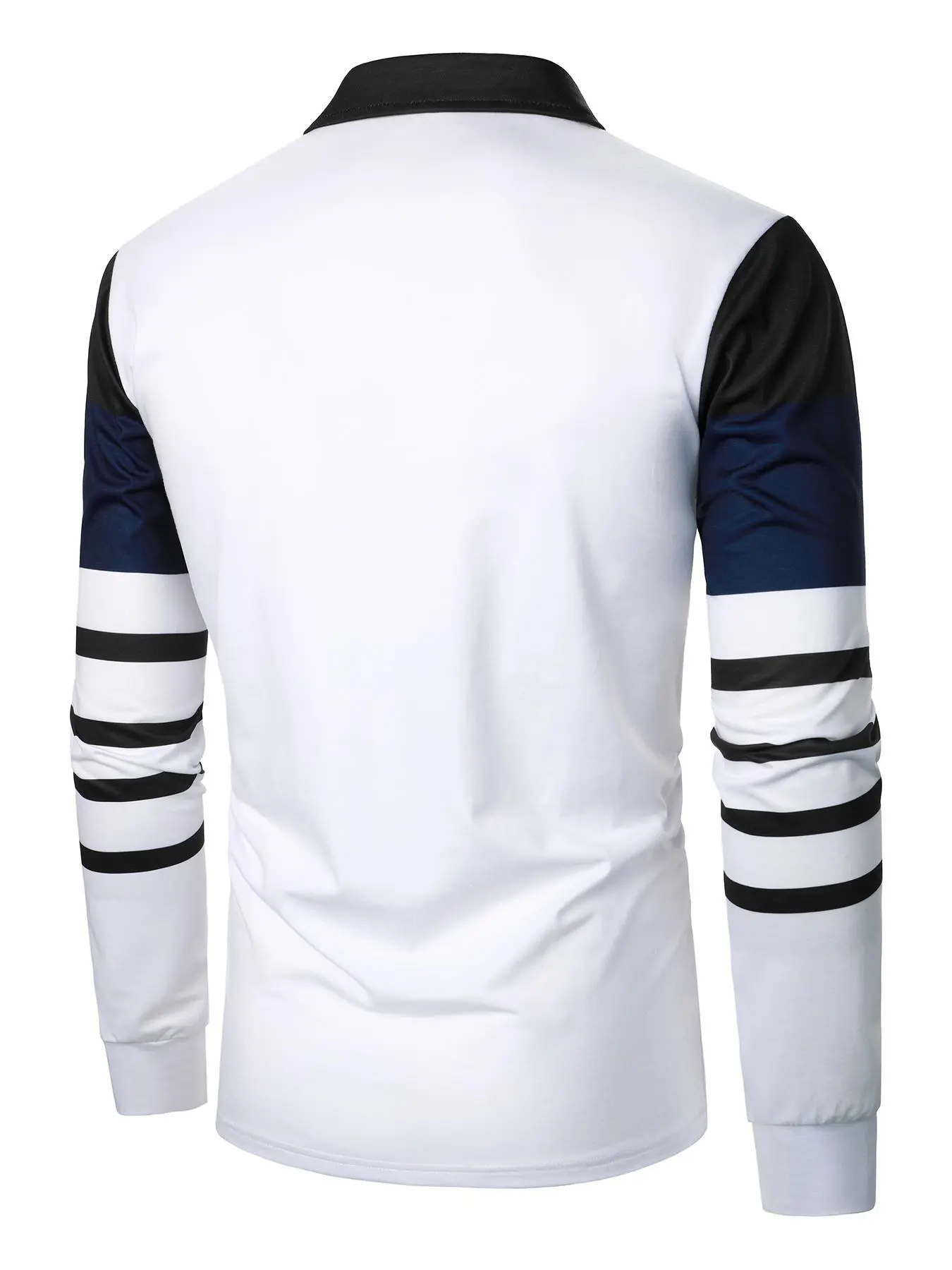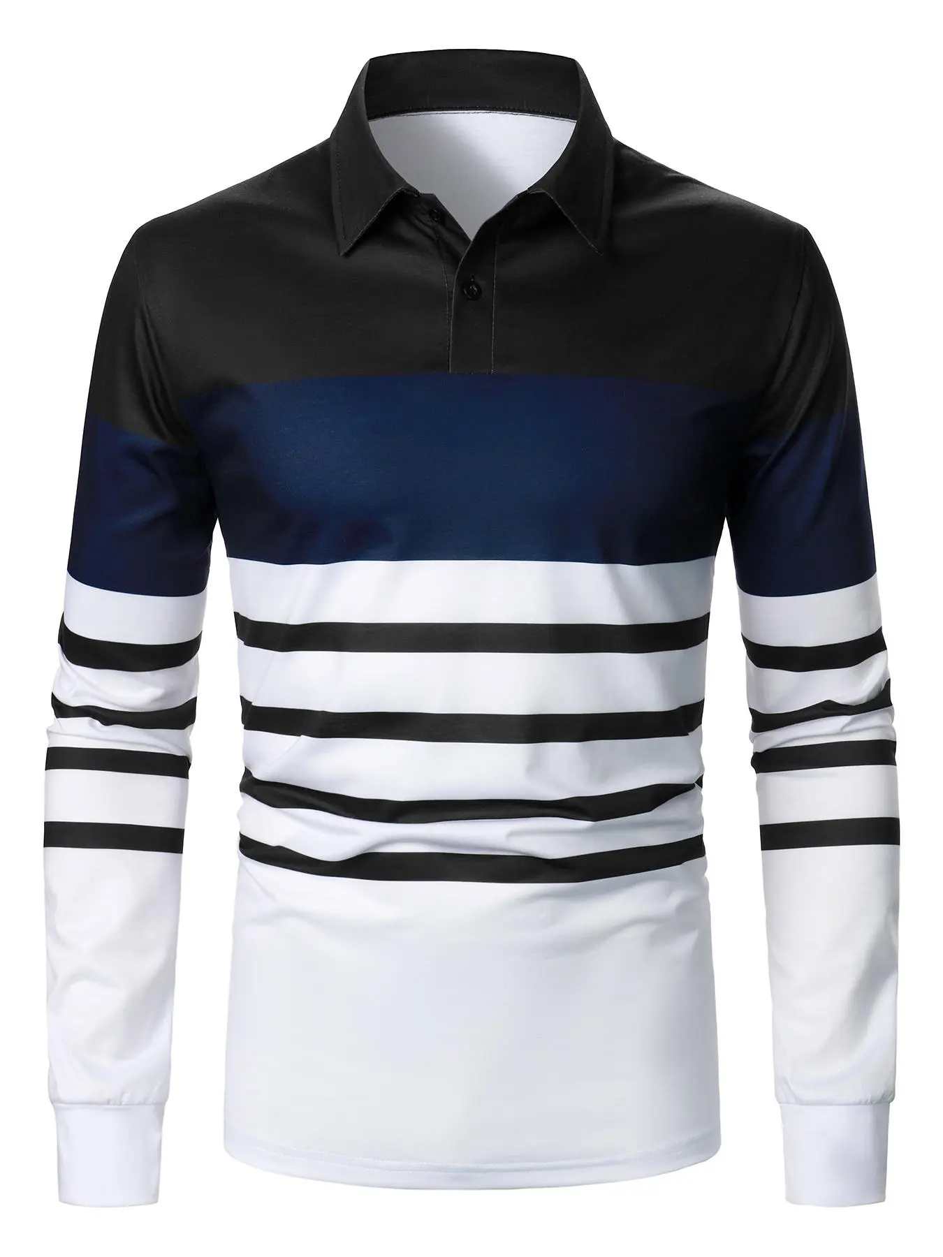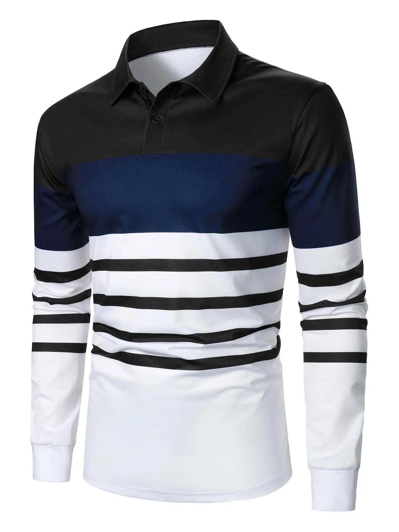 Men's Colorblock Striped Print Polo Shirt, Regular Fit Casual Long Sleeve Button Top for Fall & Winter, Men's Clothes for Daily Wear